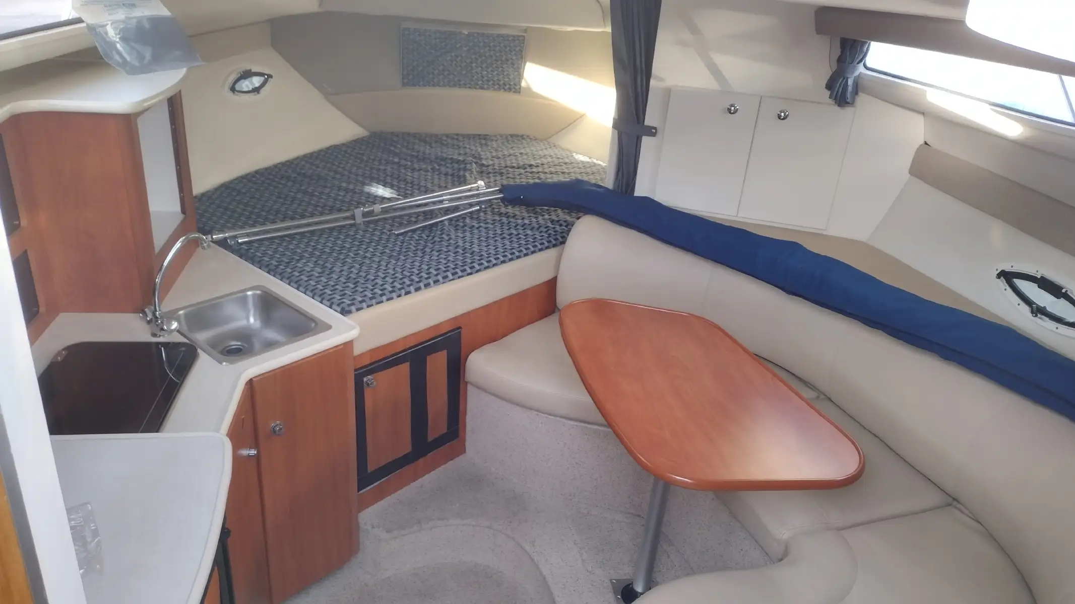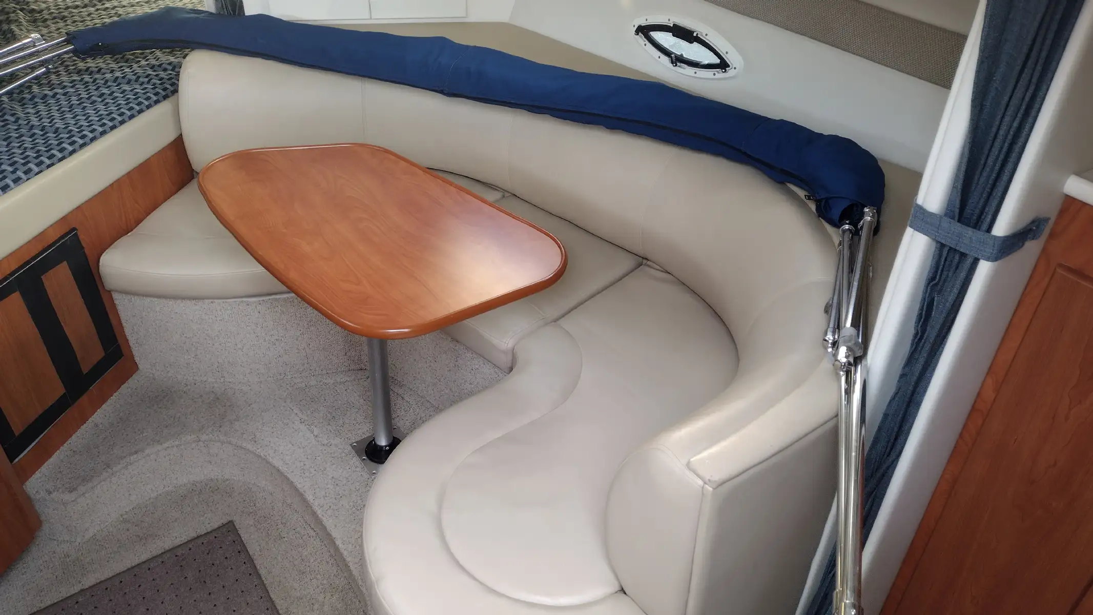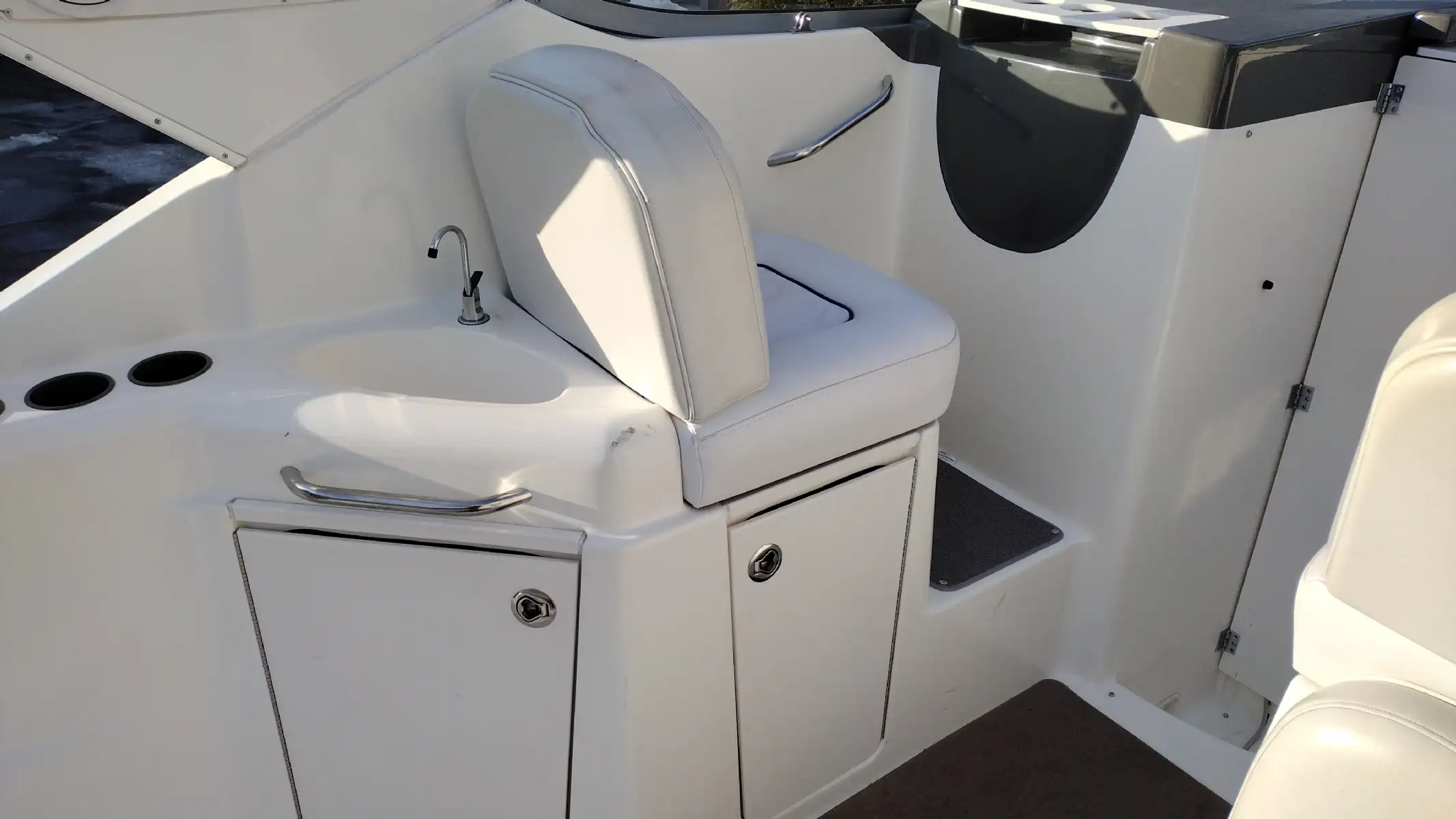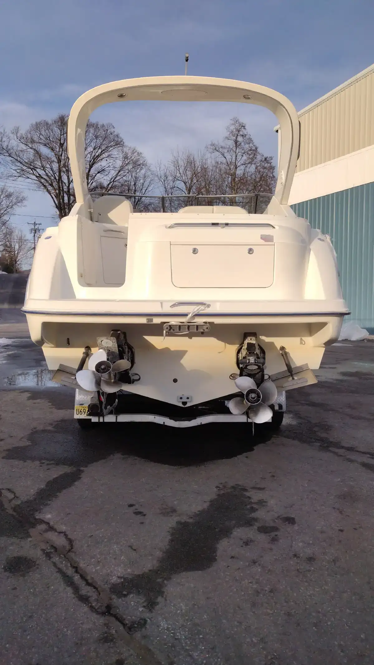 Standard Features Include; Arch w/ Camper Enclosure, Integrated Swim Platform w/ Ladder, Stainless Steel Props, Electric Windlass Anchor, Trim Tabs, Cockpit Wetbar, Battery Charger, Water Heater, Windshield Wipers, Shorepower