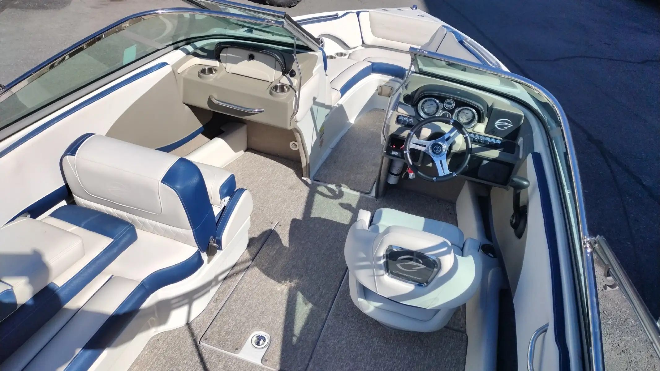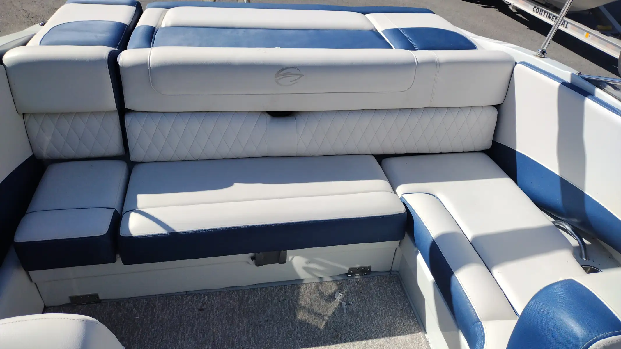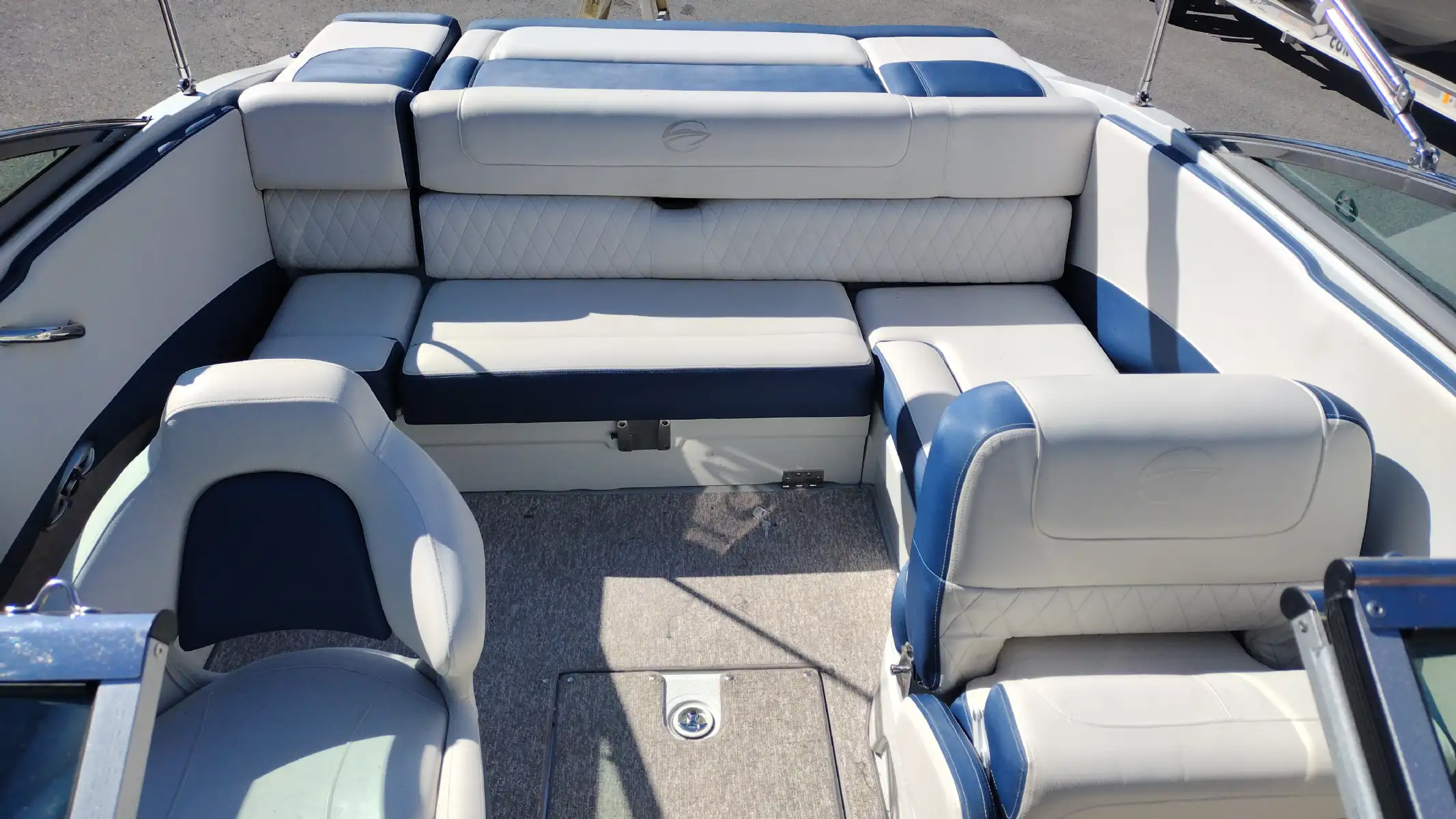 Standard Features Include; 10 Person/1312 lb Capacity, Bowrider, Bimini Top, Bow & Cockpit Covers, Swim Platform w/ Boarding Ladder, Ski Tow Eye, Stainless Steel Dual Props, Snap In Mat, In Floor Storage, Walk Thru Transom w/ Filler Cushions, Removable Cockpit Table, Battery Charger, Dual Batteries w/ Switch