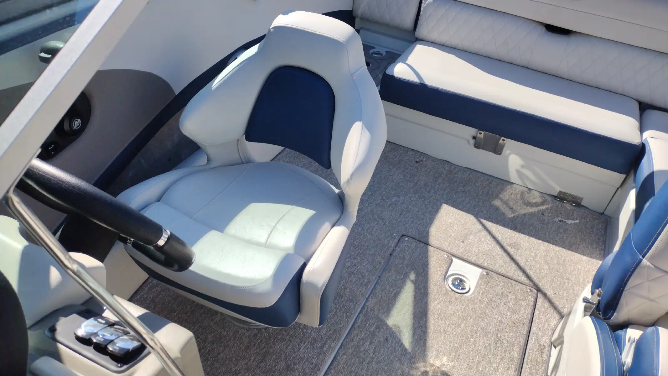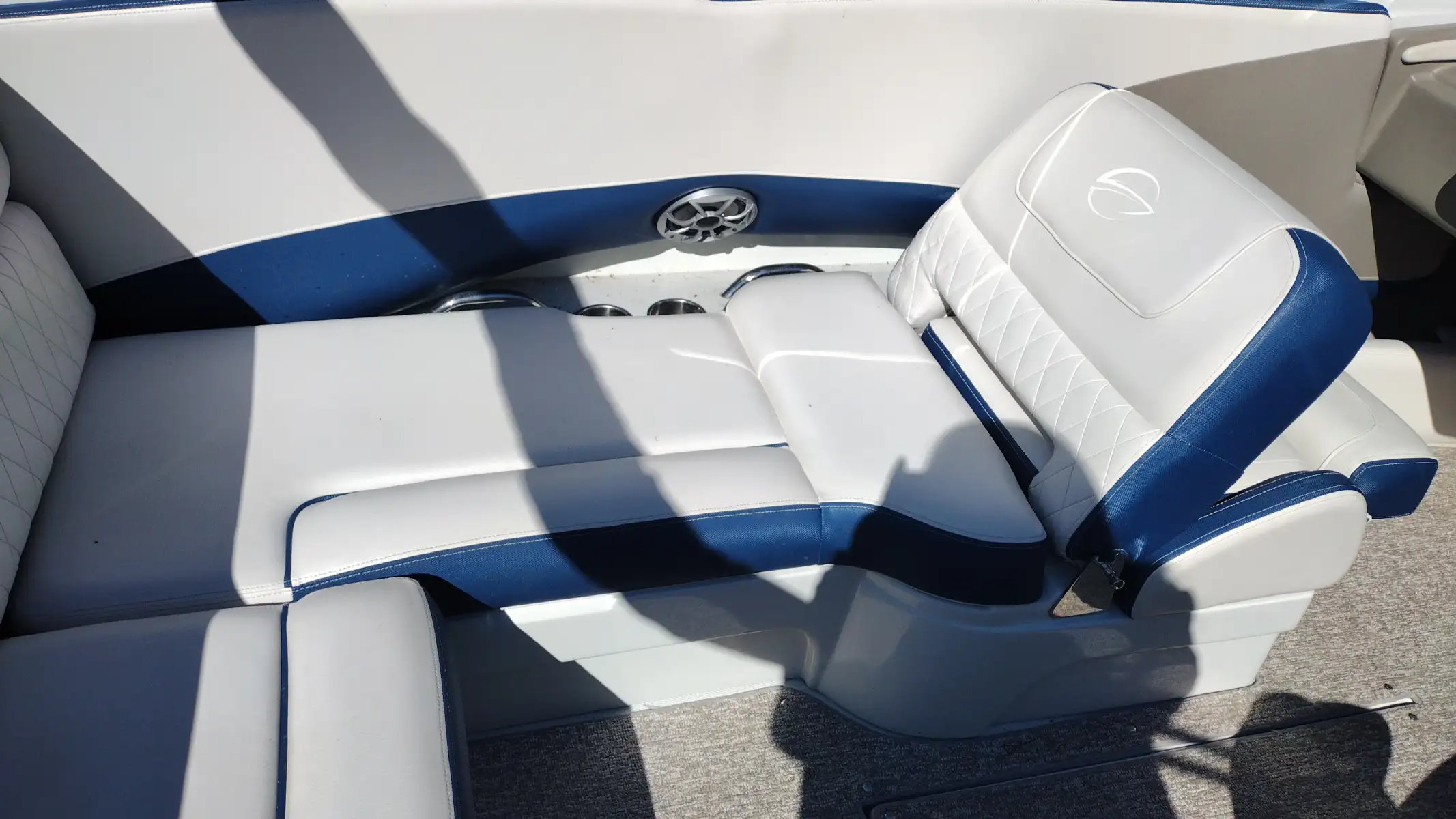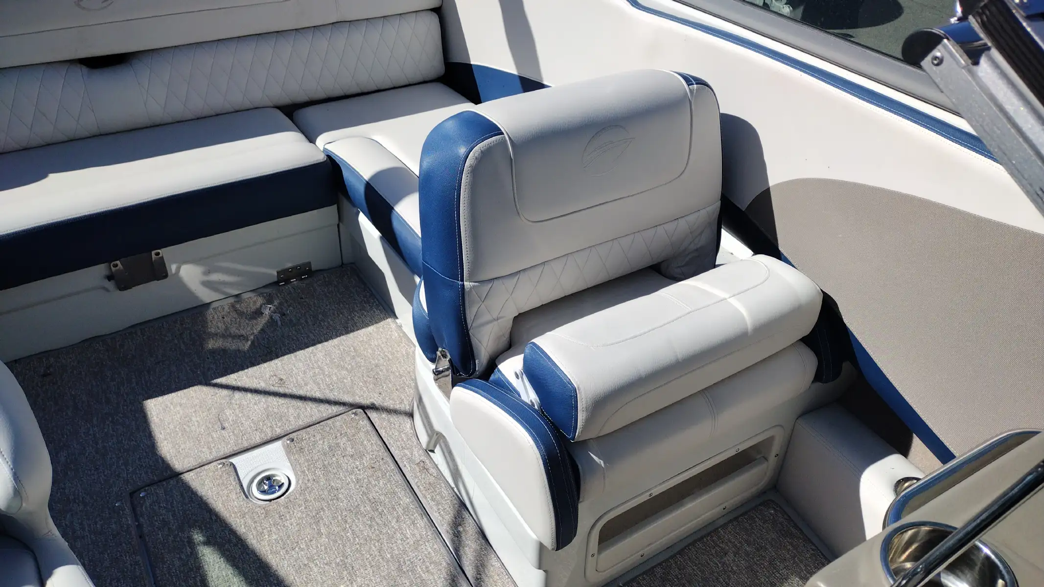 Standard Features Include; 10 Person/1312 lb Capacity, Bowrider, Bimini Top, Bow & Cockpit Covers, Swim Platform w/ Boarding Ladder, Ski Tow Eye, Stainless Steel Dual Props, Snap In Mat, In Floor Storage, Walk Thru Transom w/ Filler Cushions, Removable Cockpit Table, Battery Charger, Dual Batteries w/ Switch