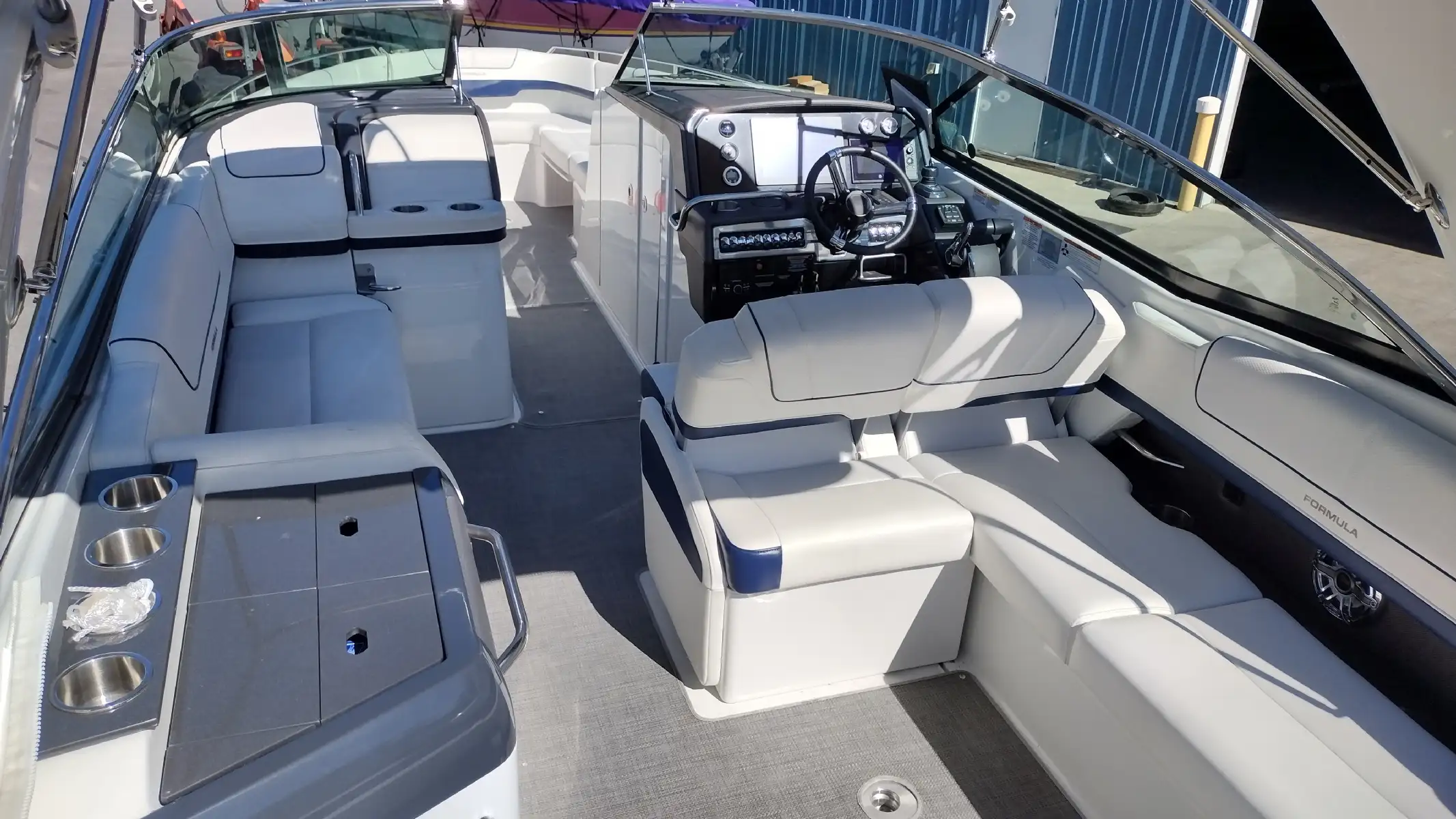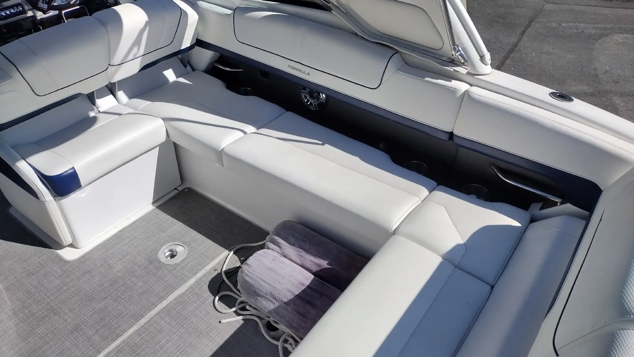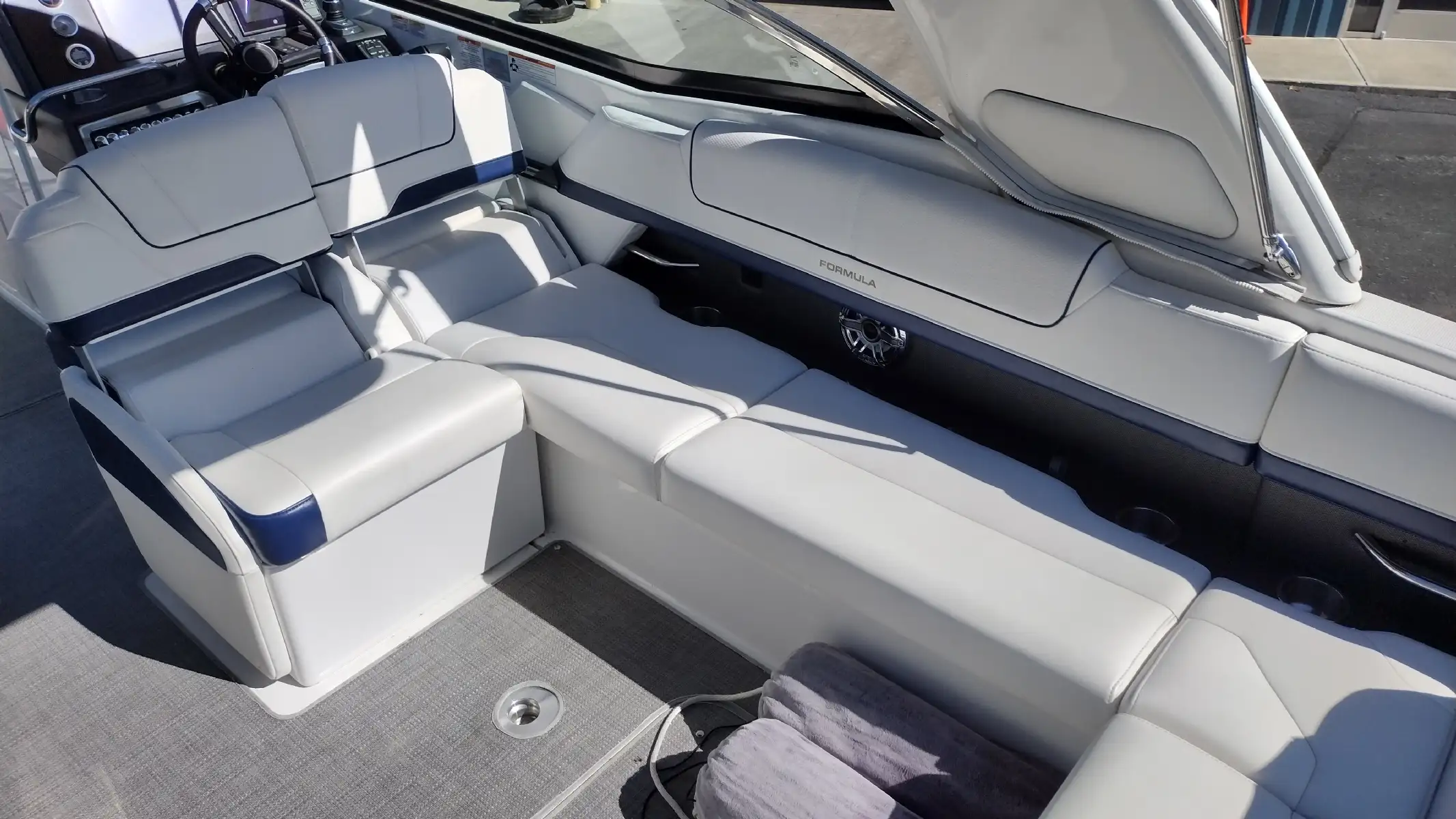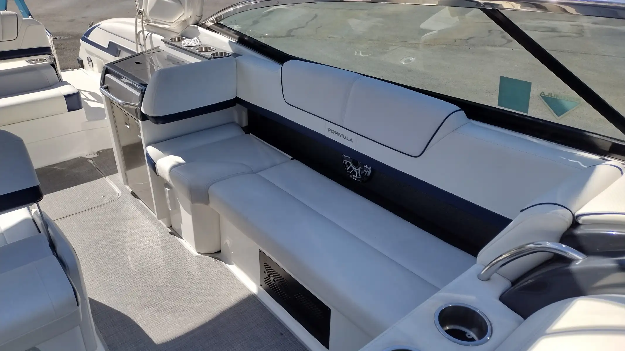Standard Features Include; Bowrider w/Filler Cushions & Backrest, Bimini Top w/ Arch & Front/Sides/Aft Curtains, All-weather Bow & Cockpit Cover, Woven Cockpit Mat, Swim Platform w/Ladder, Fender Clips, Bow Docking Lights, Remote Bow Spotlight, Electric Windlass Anchor, Cockpit Refrigerator, Blue LED Lighting System, Vacuflush Head w/ Holding Tank & Pumpout, Cockpit Wetbar w/Sink & Dry Storage, Cockpit Heater, Transom Gate, SS Dual Props, 20 Amp Battery Charger, Auto Fire Extinguisher, 2 Removable Dual Height Tables w/ Filler Cushions & Drink Holders, Aft Facing Sun Lounge w/Dual Position Backrests, In Floor Wakeboard/Ski Storage, Gray Water System, Shorepower, Blue/White LED Courtesy Lights w/Remote