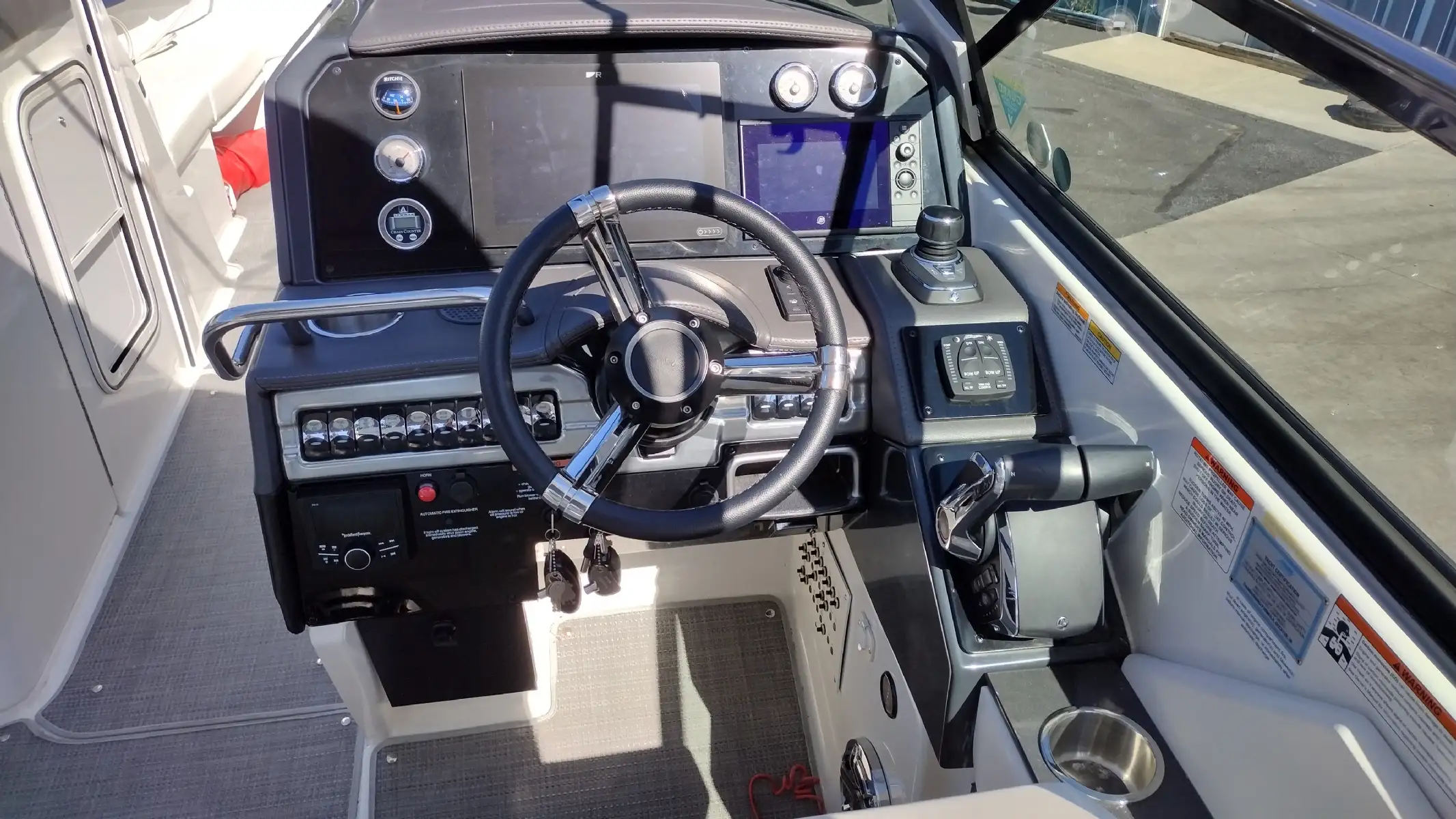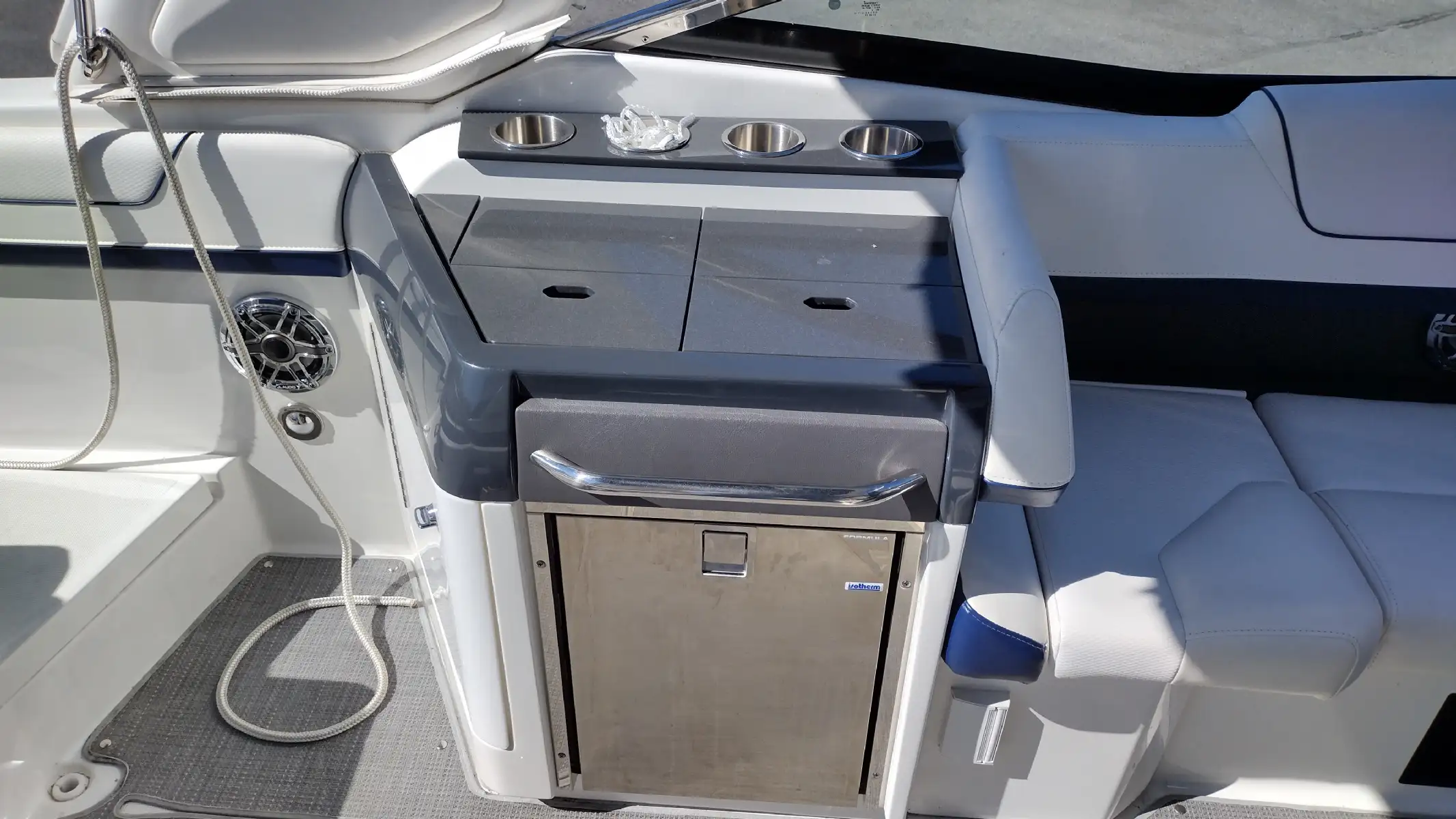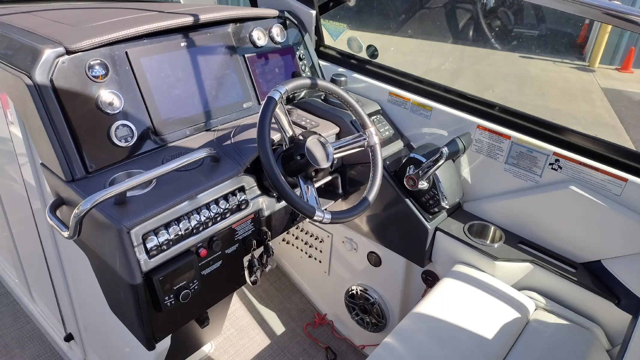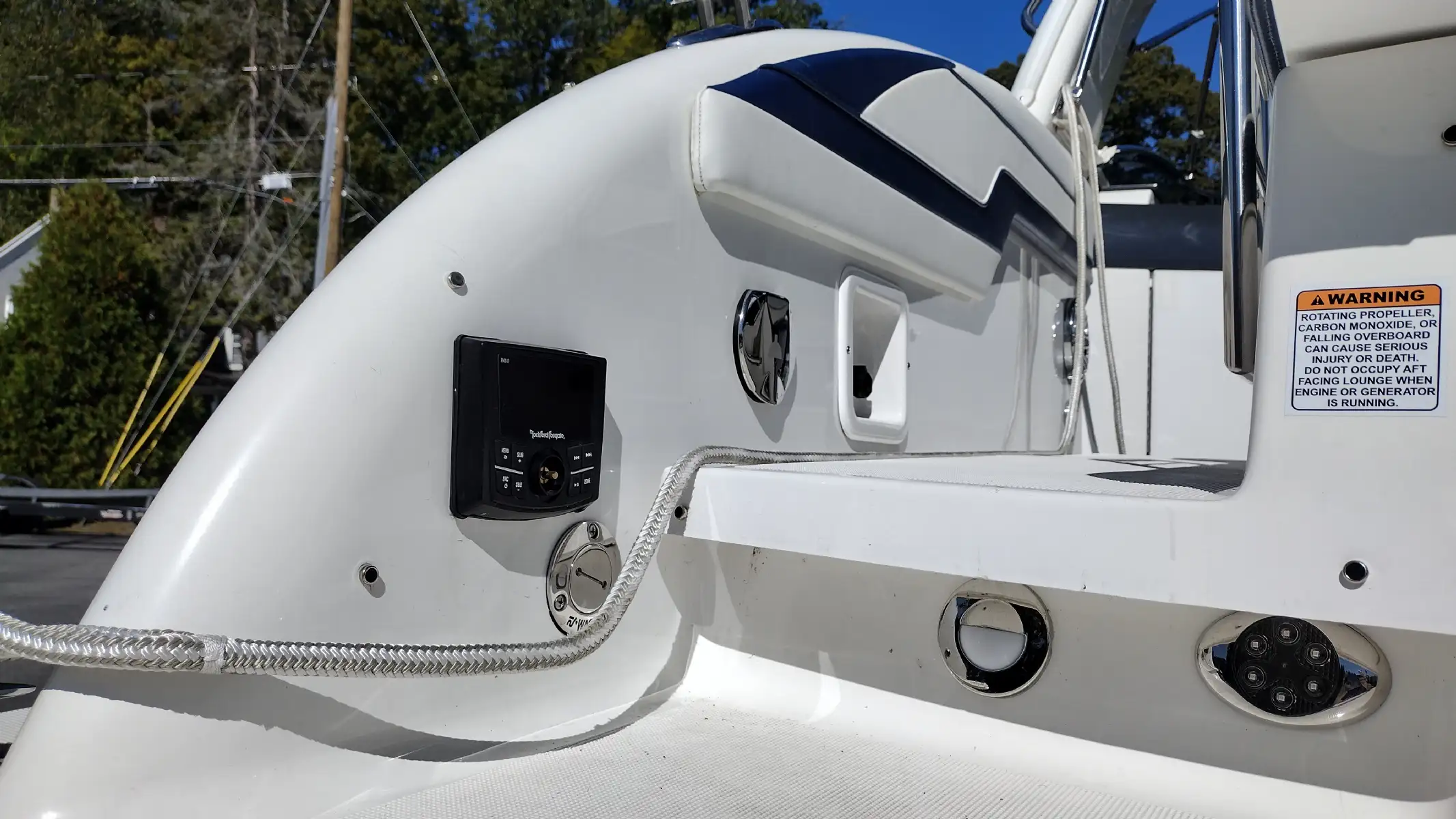Electronics Include; Raymarine Axiom +12 Chartplotter w/ Depth Sounder & Remote Keypad, Rockford Fosgate AM/FM Stereo w/iPod/USB/Bluetooth Docking Station w/Amp & Subwoofer & Remotes at the Helm & Transom, JL Audio Lighted Speakers & 200w Sub & 600w Amp, Mercury DTS w/ SmartCraft VesselView Engine Monitor, Ritchie Compass, Captain’s Wireless Charging Pad