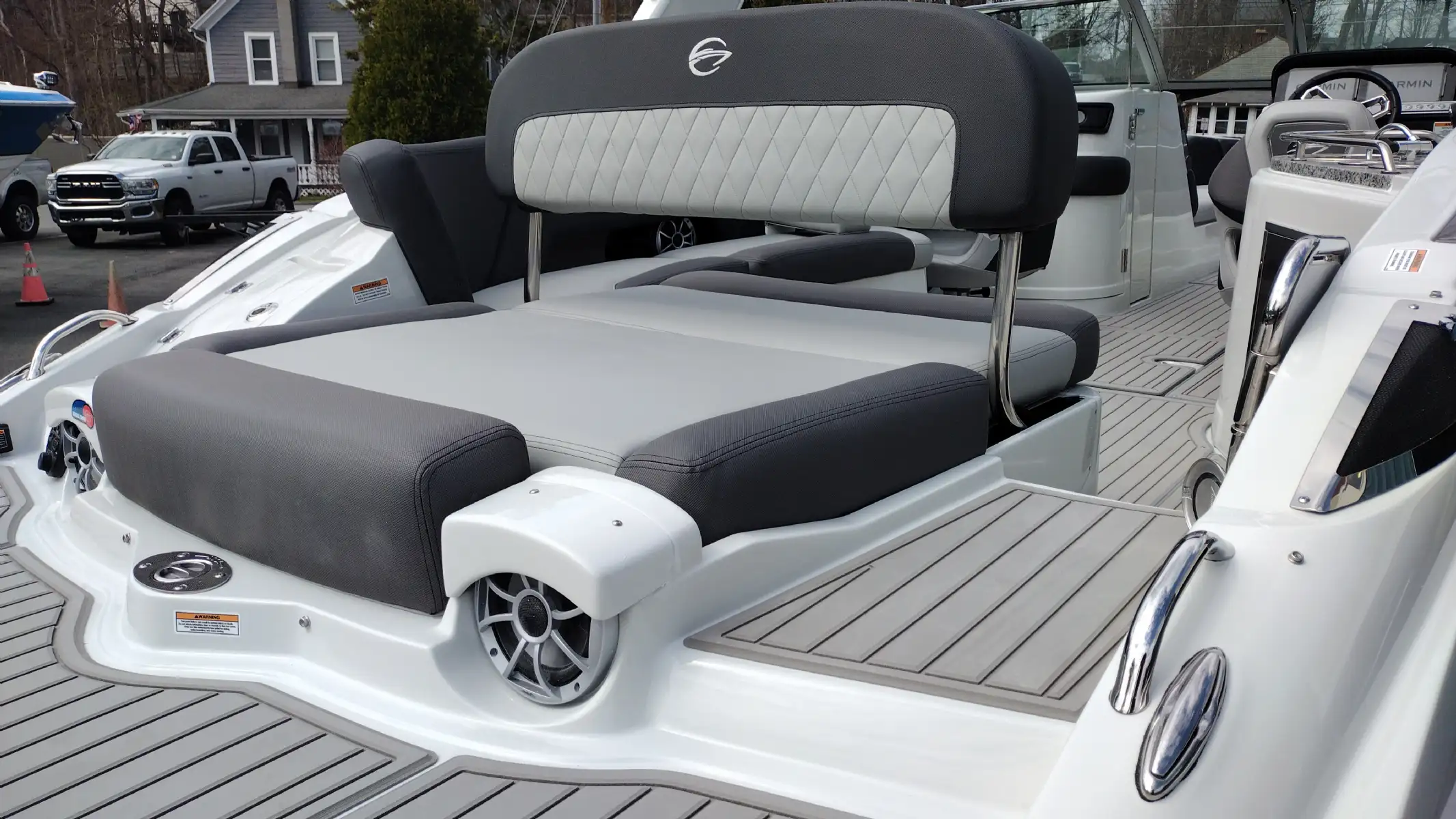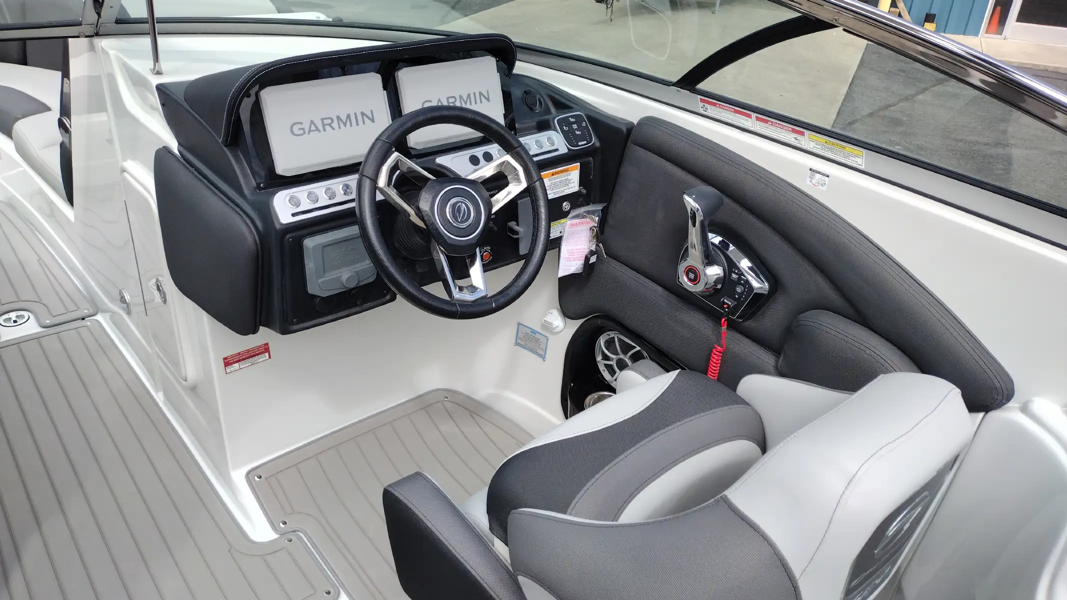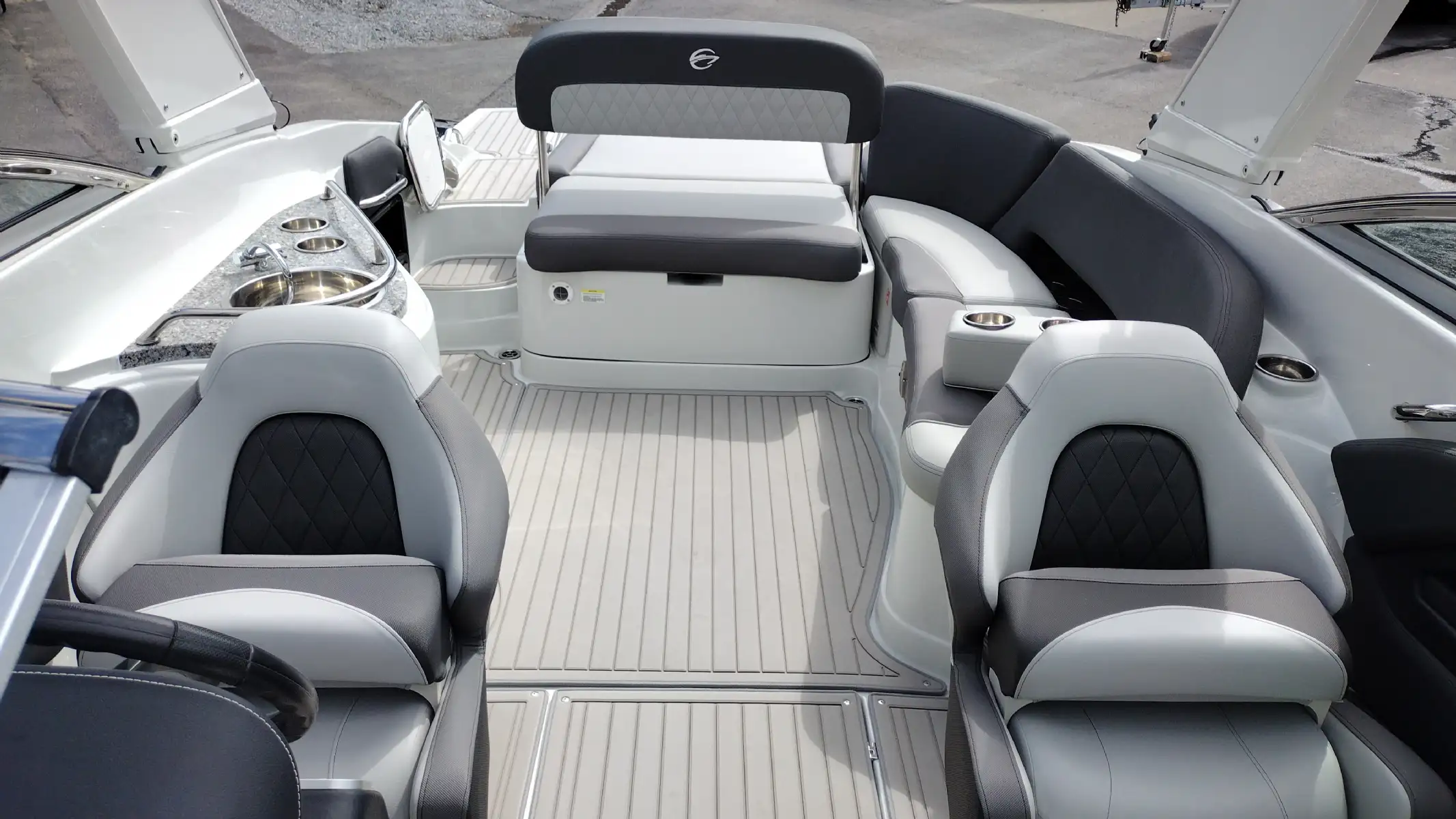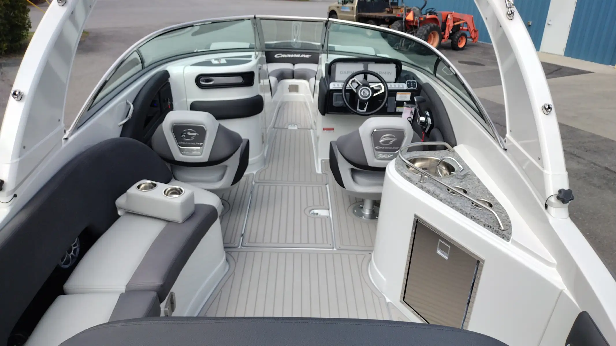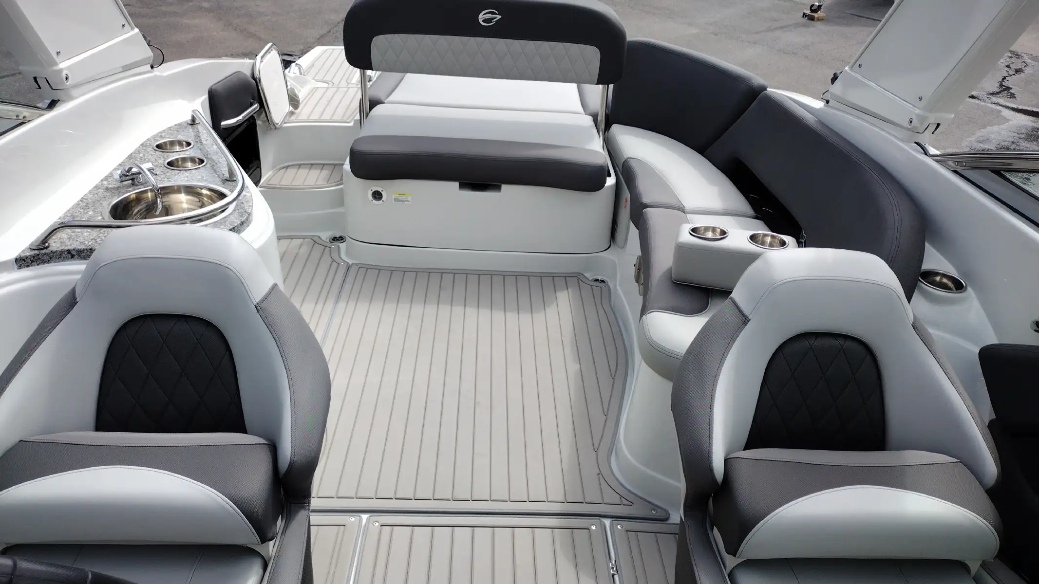 Standard Features Include; Bowrider, Bow & Cockpit Cover, Electric Fold Down Arch w/Sun Top & LED Lights, Snap In Soft Touch Mat, Cockpit Sink & Refrigerator, Battery Charger, Windlass Anchor, Cell Phone Holder w/Wireless Charging & USB-C Port, Enclosed Electric Flush Head w/Holding Tank & Vanity w/Sink, Docking Lights, LED Courtesy Lights w/Keychain Remote, Underwater Transom Lights, Powered Swim Step w/Boarding Assist Handle, Swim Platform w/ Soft Touch Mat & Ladder, Aft Electric Sun Lounge w/Dual Actuators, Hand-held Cold Freshwater Shower at Stern, Pop up Steel Ski Tow, Portable Side Mount Table, Transom Trim Switch, Trim Tabs w/Indicators, Fender Clips