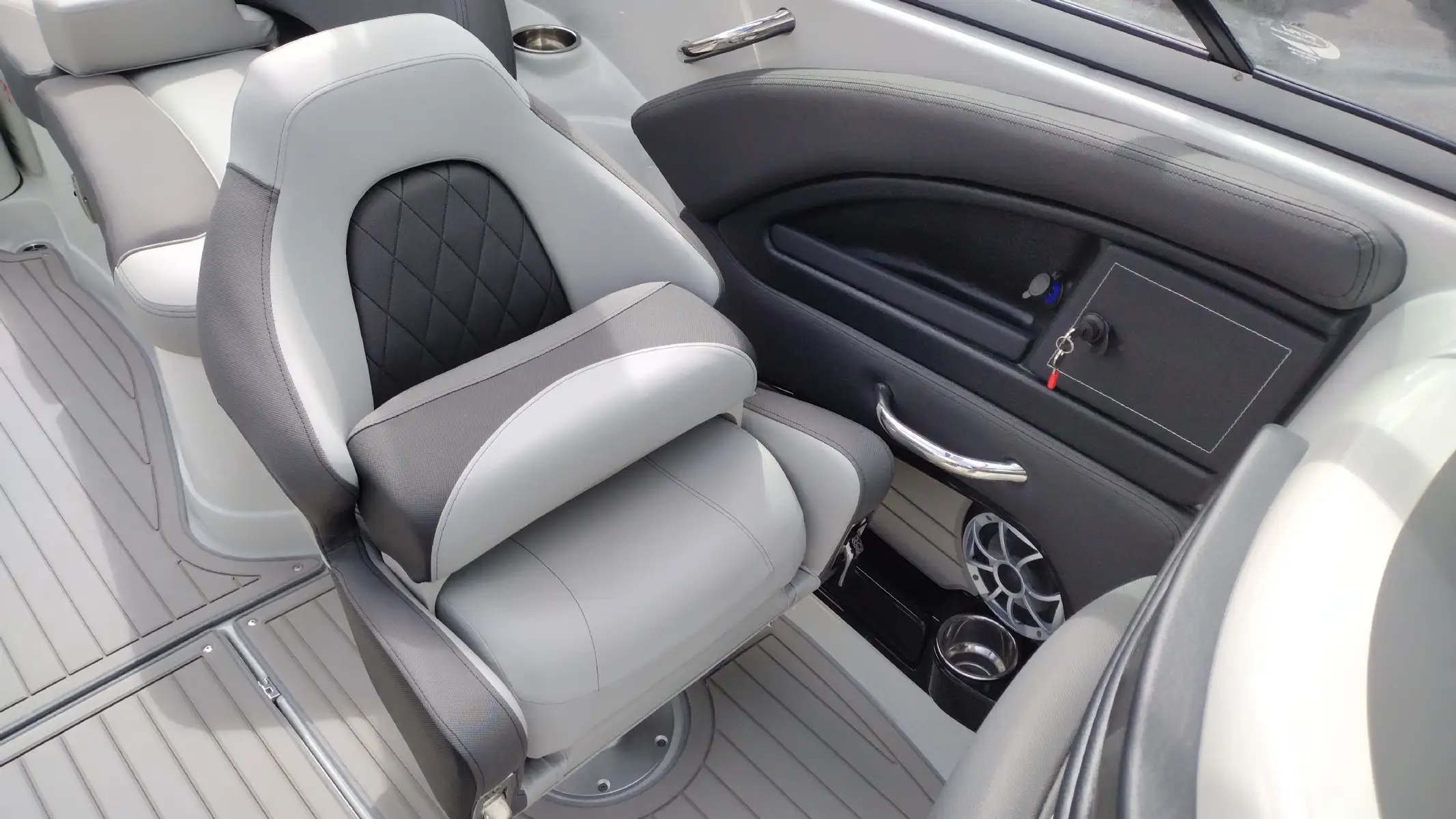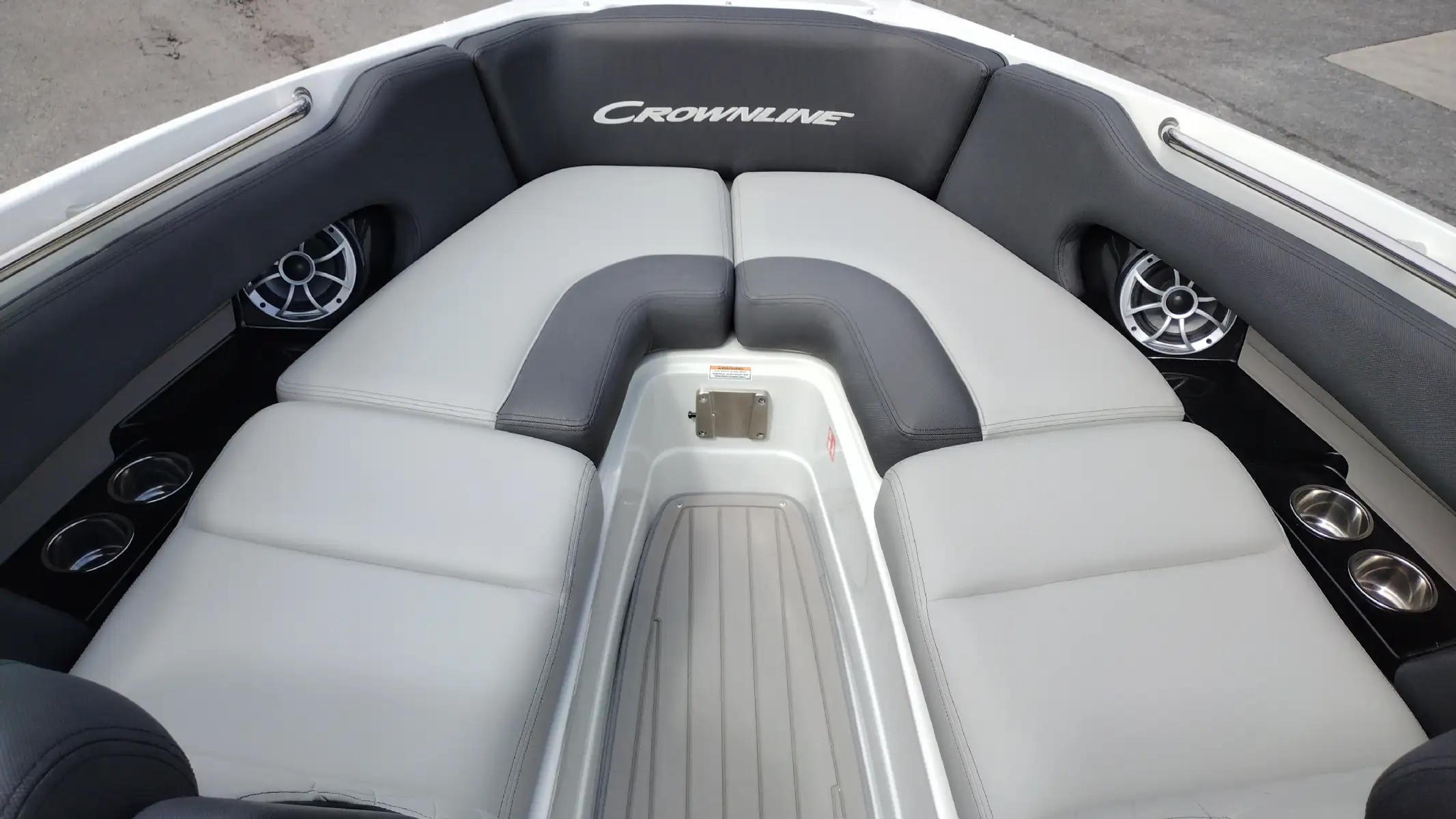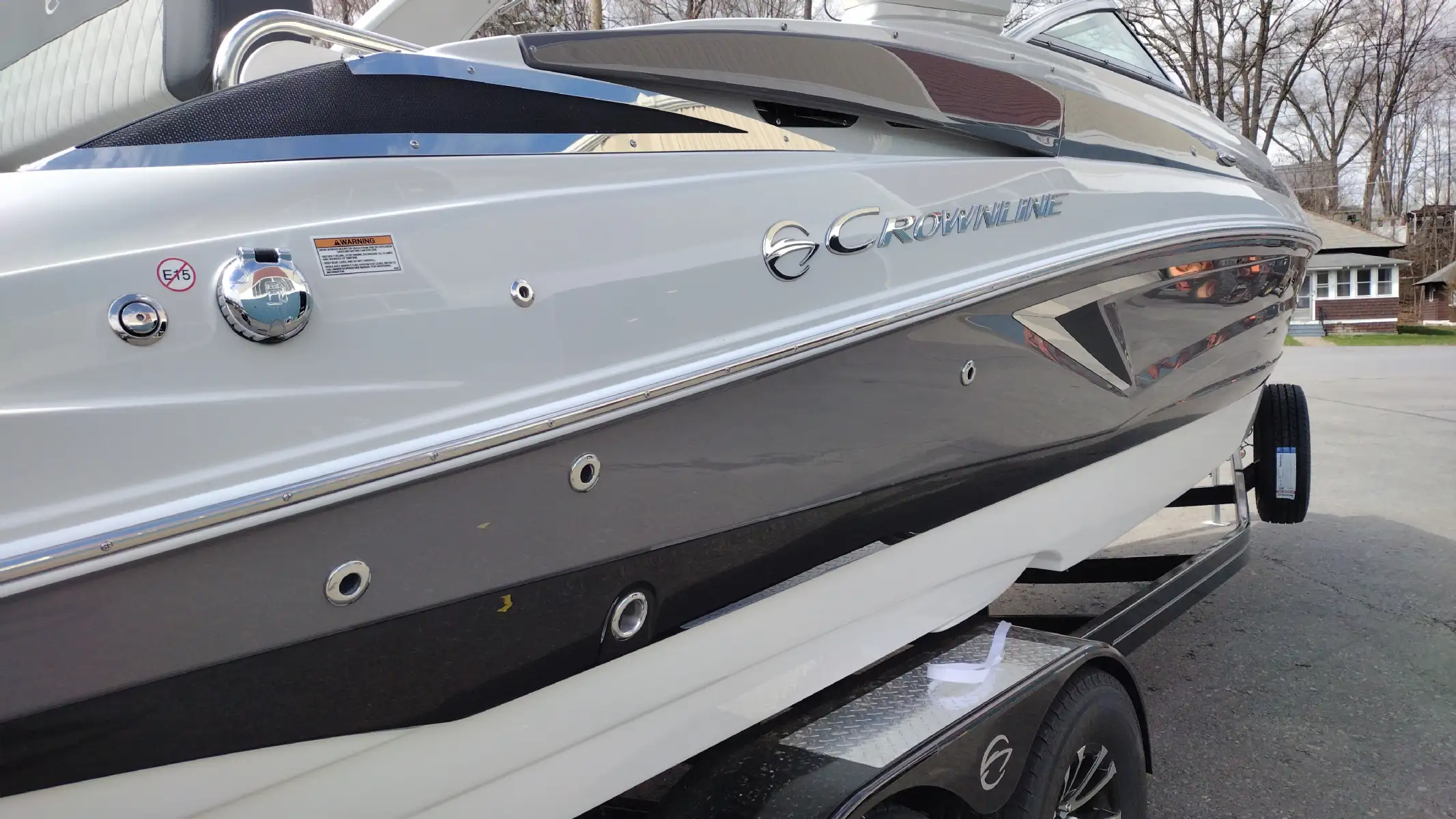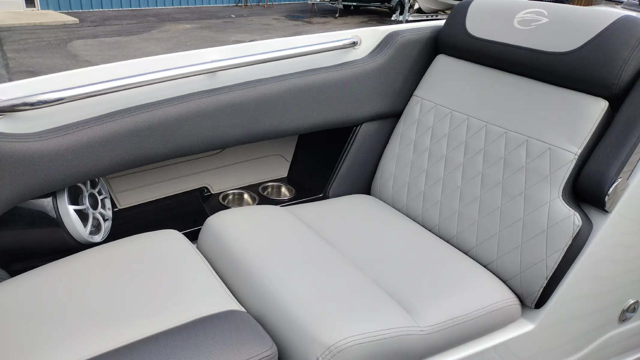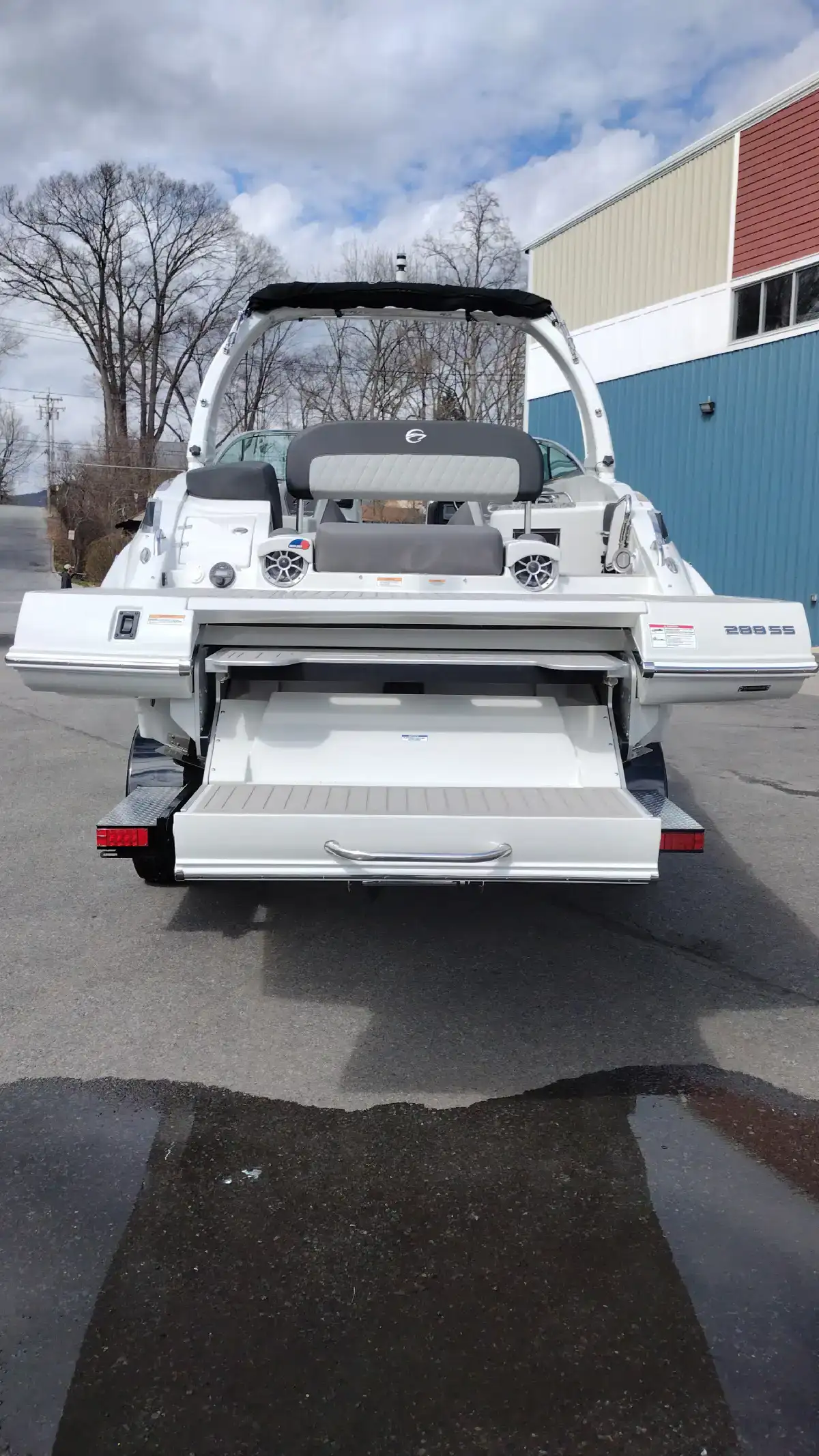 Standard Features Include; Bowrider, Bow & Cockpit Cover, Electric Fold Down Arch w/Sun Top & LED Lights, Snap In Soft Touch Mat, Cockpit Sink & Refrigerator, Battery Charger, Windlass Anchor, Cell Phone Holder w/Wireless Charging & USB-C Port, Enclosed Electric Flush Head w/Holding Tank & Vanity w/Sink, Docking Lights, LED Courtesy Lights w/Keychain Remote, Underwater Transom Lights, Powered Swim Step w/Boarding Assist Handle, Swim Platform w/ Soft Touch Mat & Ladder, Aft Electric Sun Lounge w/Dual Actuators, Hand-held Cold Freshwater Shower at Stern, Pop up Steel Ski Tow, Portable Side Mount Table, Transom Trim Switch, Trim Tabs w/Indicators, Fender Clips