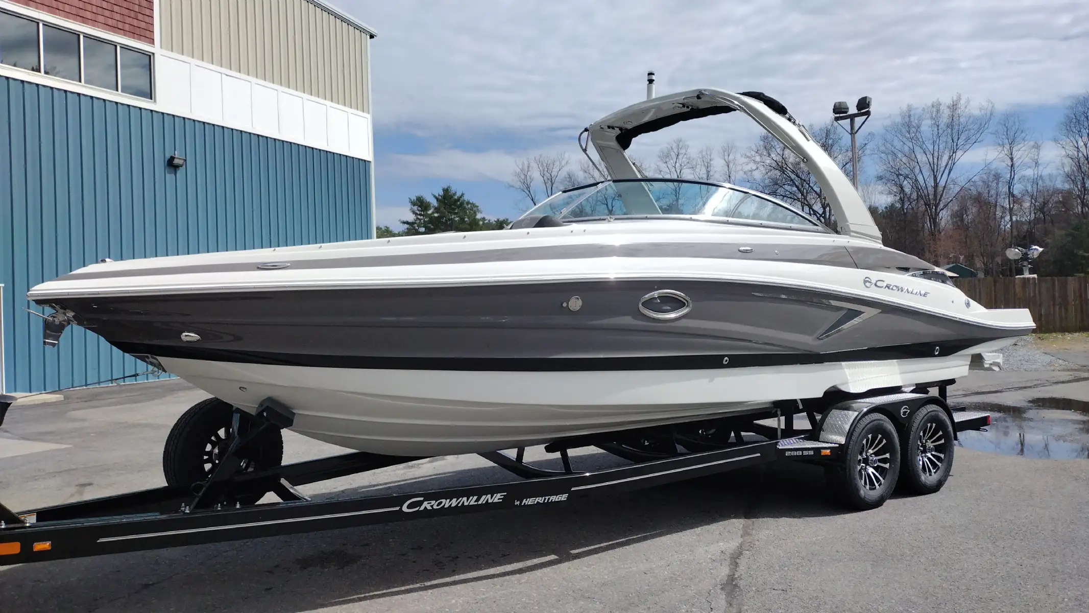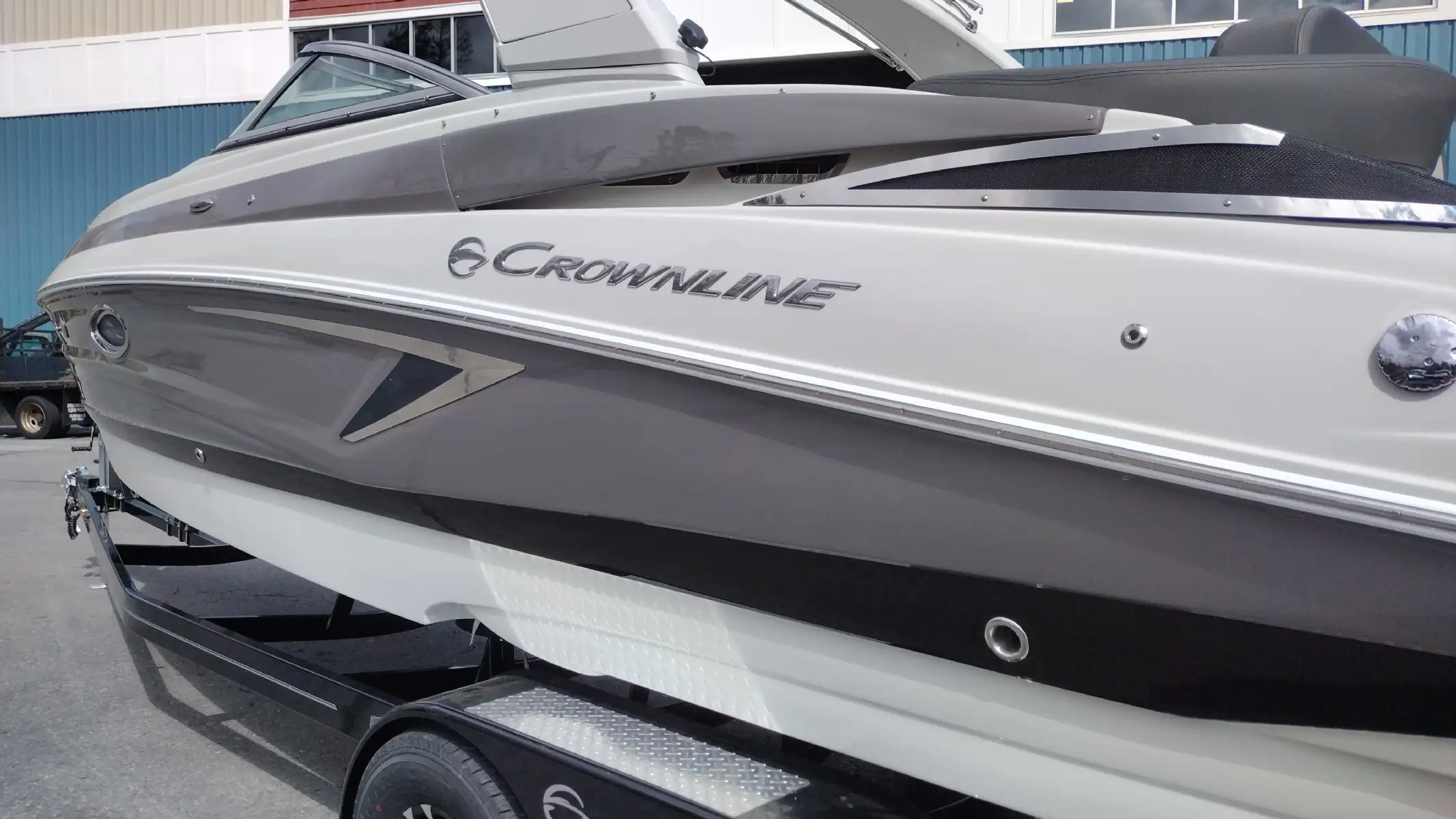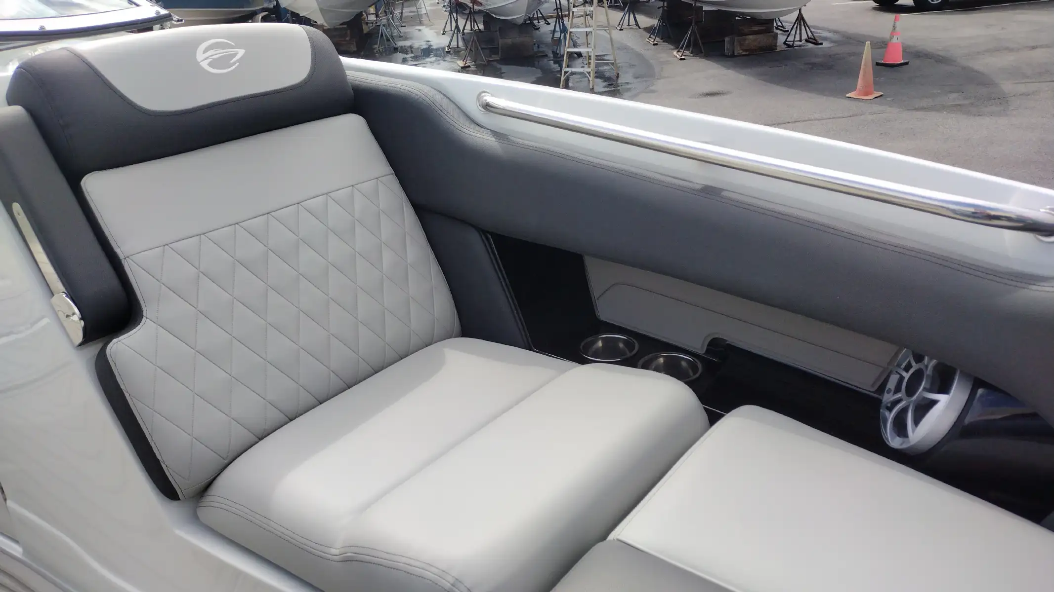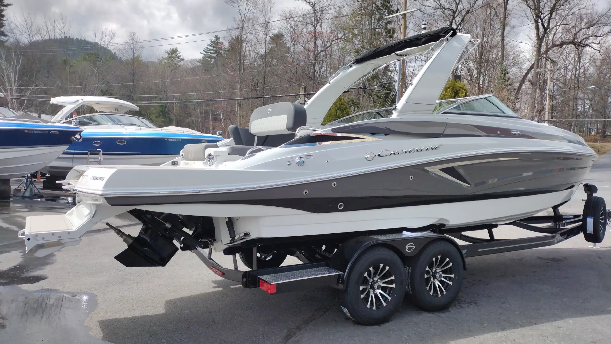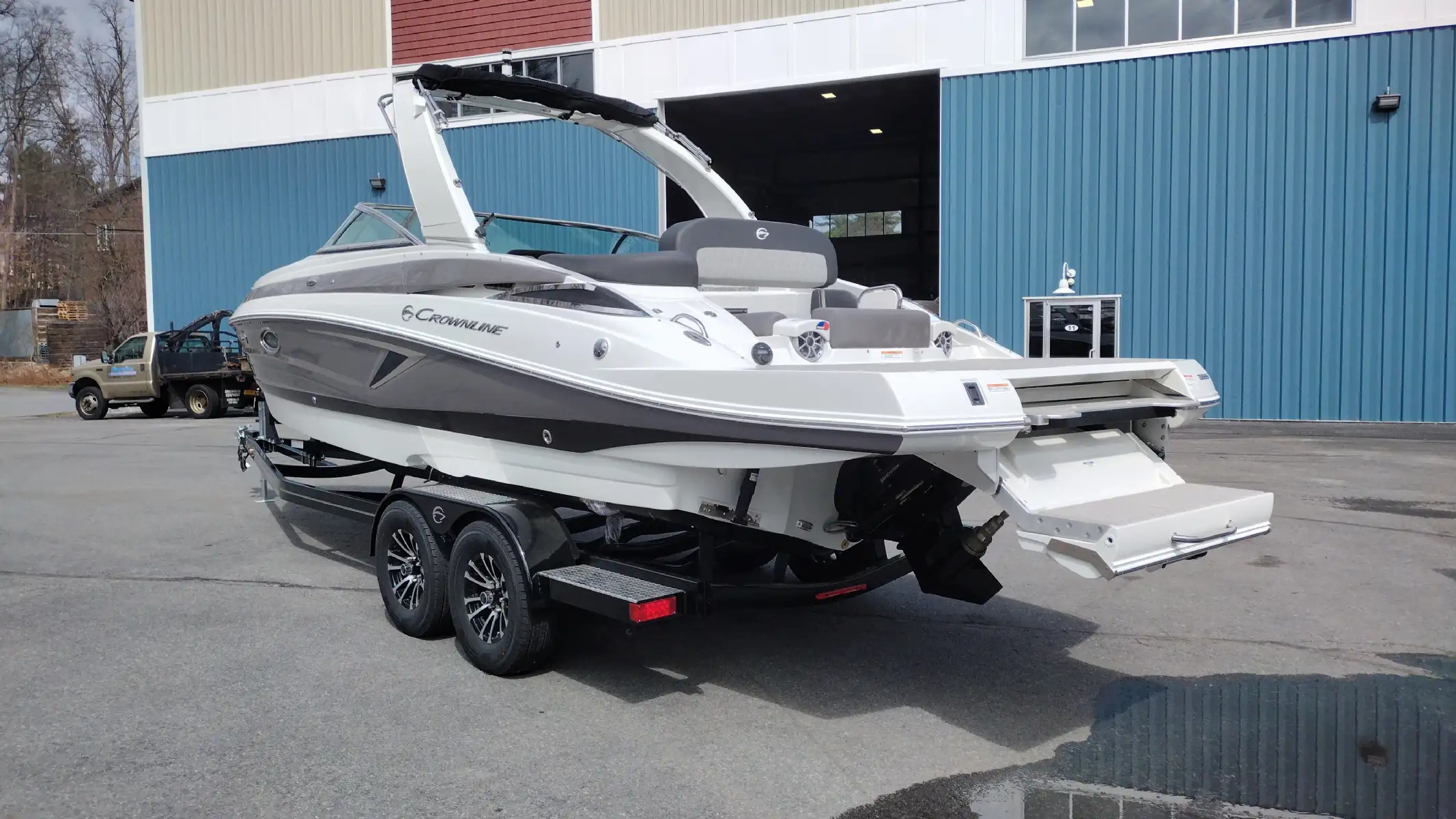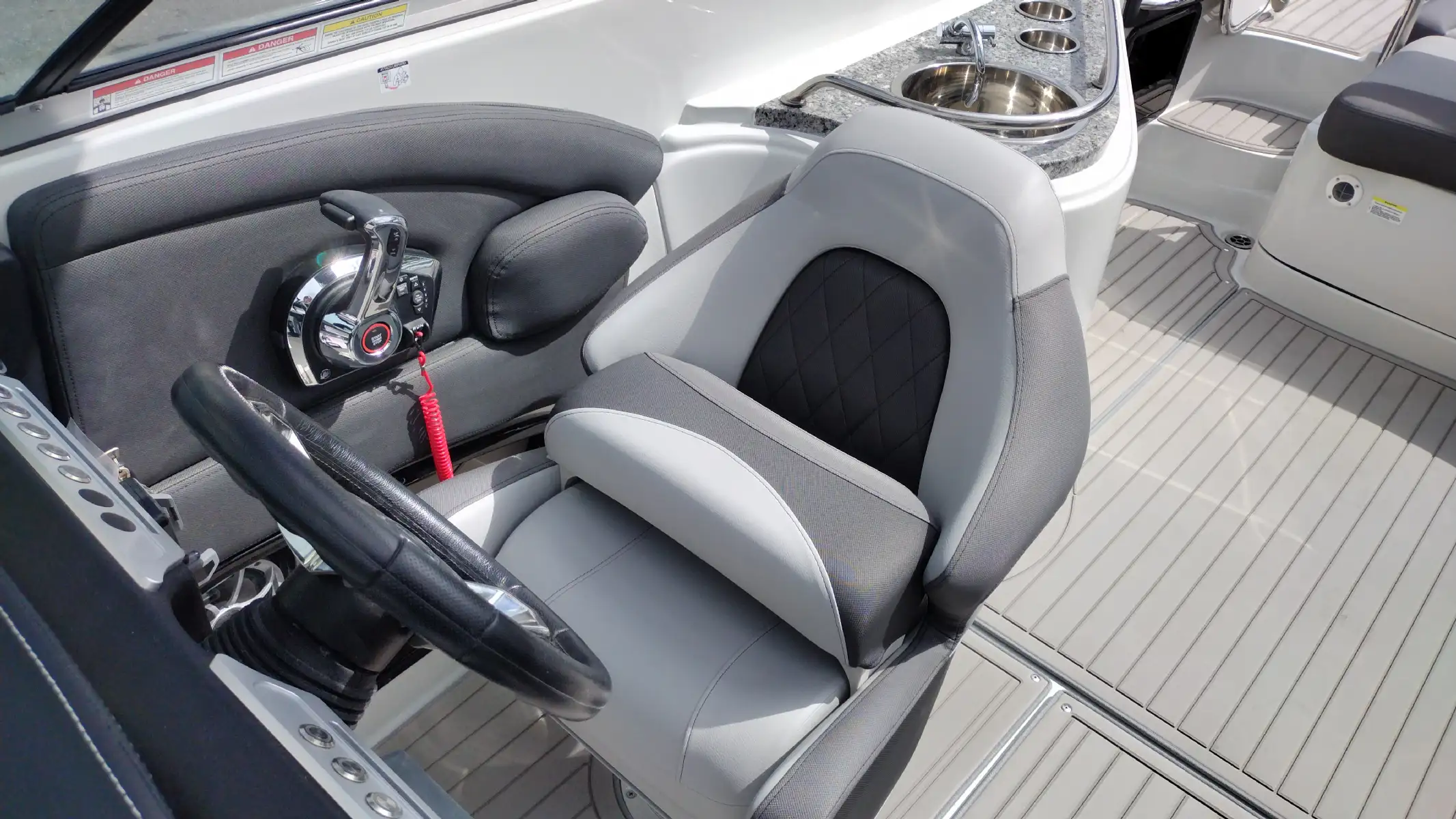 Standard Features Include; Bowrider, Bow & Cockpit Cover, Electric Fold Down Arch w/Sun Top & LED Lights, Snap In Soft Touch Mat, Cockpit Sink & Refrigerator, Battery Charger, Windlass Anchor, Cell Phone Holder w/Wireless Charging & USB-C Port, Enclosed Electric Flush Head w/Holding Tank & Vanity w/Sink, Docking Lights, LED Courtesy Lights w/Keychain Remote, Underwater Transom Lights, Powered Swim Step w/Boarding Assist Handle, Swim Platform w/ Soft Touch Mat & Ladder, Aft Electric Sun Lounge w/Dual Actuators, Hand-held Cold Freshwater Shower at Stern, Pop up Steel Ski Tow, Portable Side Mount Table, Transom Trim Switch, Trim Tabs w/Indicators, Fender Clips