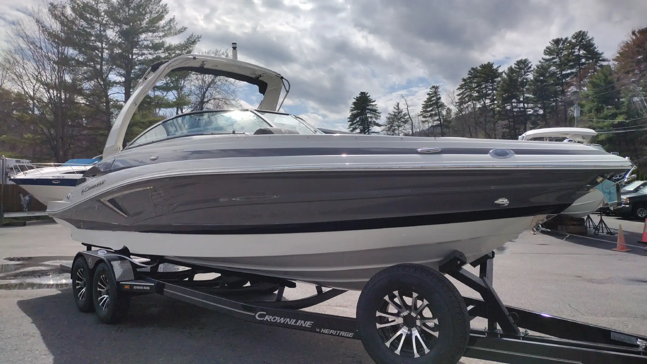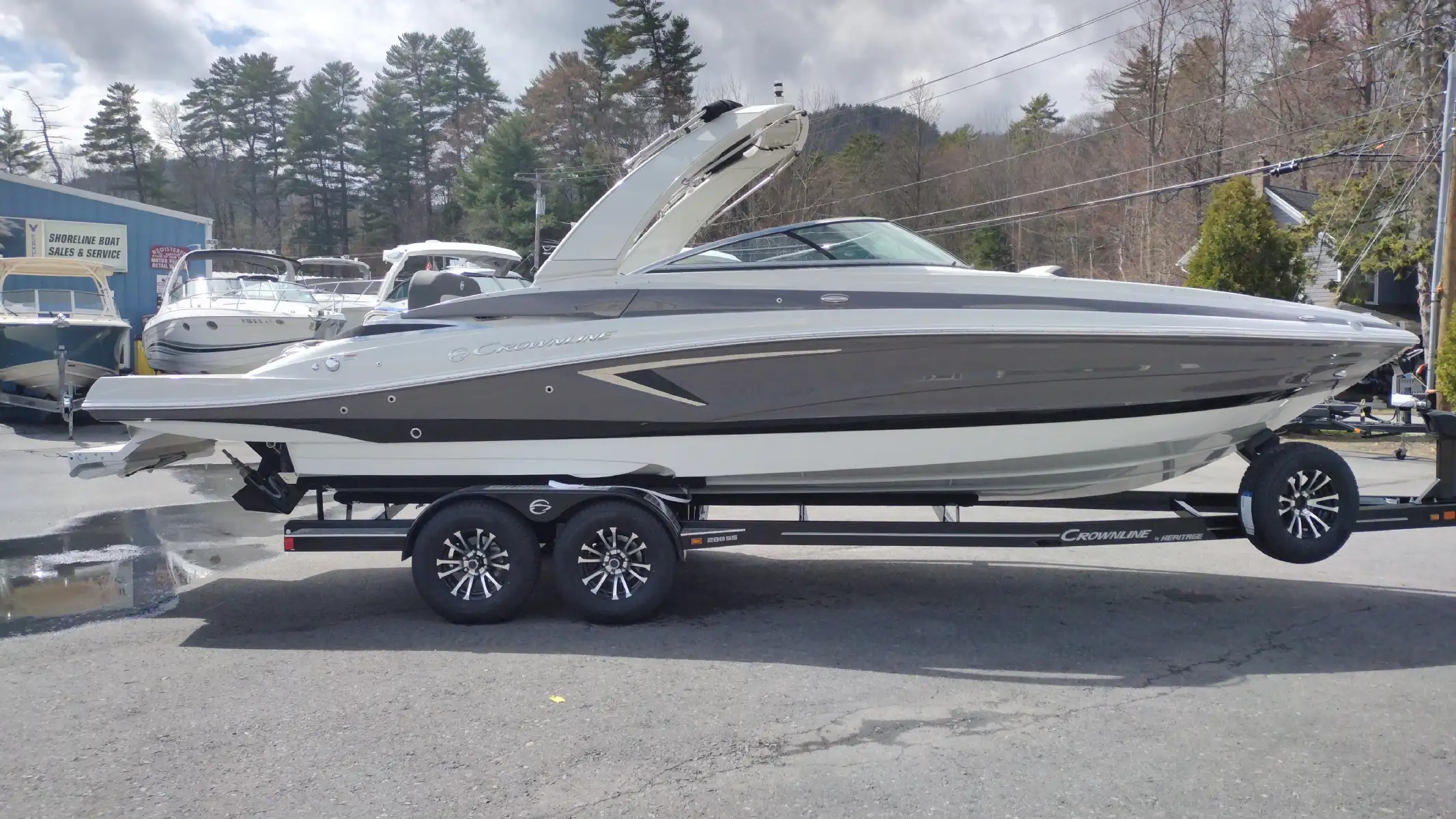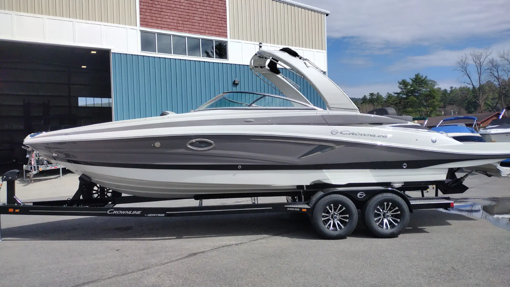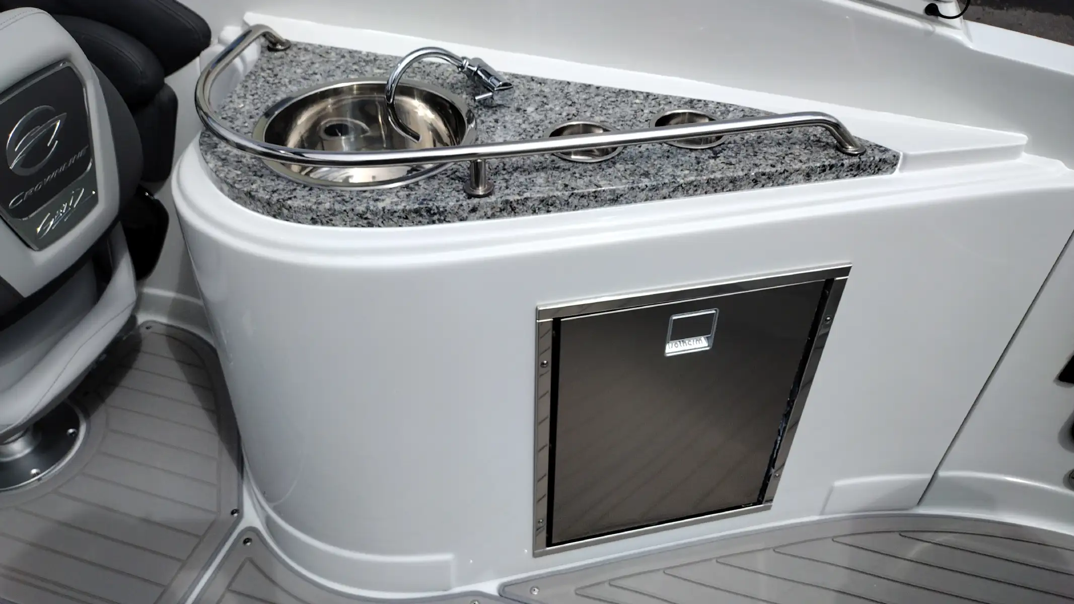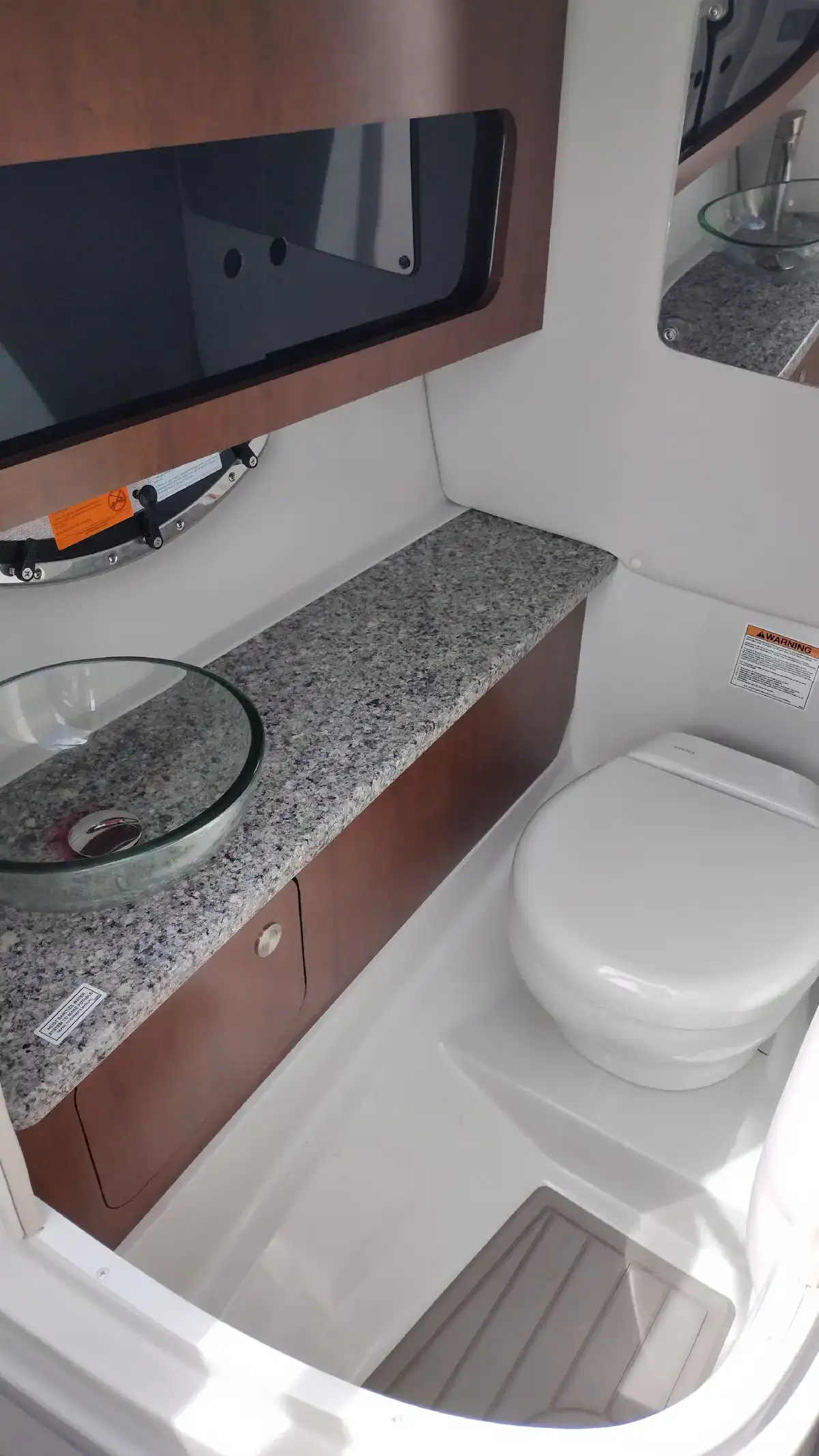 Standard Features Include; Bowrider, Bow & Cockpit Cover, Electric Fold Down Arch w/Sun Top & LED Lights, Snap In Soft Touch Mat, Cockpit Sink & Refrigerator, Battery Charger, Windlass Anchor, Cell Phone Holder w/Wireless Charging & USB-C Port, Enclosed Electric Flush Head w/Holding Tank & Vanity w/Sink, Docking Lights, LED Courtesy Lights w/Keychain Remote, Underwater Transom Lights, Powered Swim Step w/Boarding Assist Handle, Swim Platform w/ Soft Touch Mat & Ladder, Aft Electric Sun Lounge w/Dual Actuators, Hand-held Cold Freshwater Shower at Stern, Pop up Steel Ski Tow, Portable Side Mount Table, Transom Trim Switch, Trim Tabs w/Indicators, Fender Clips