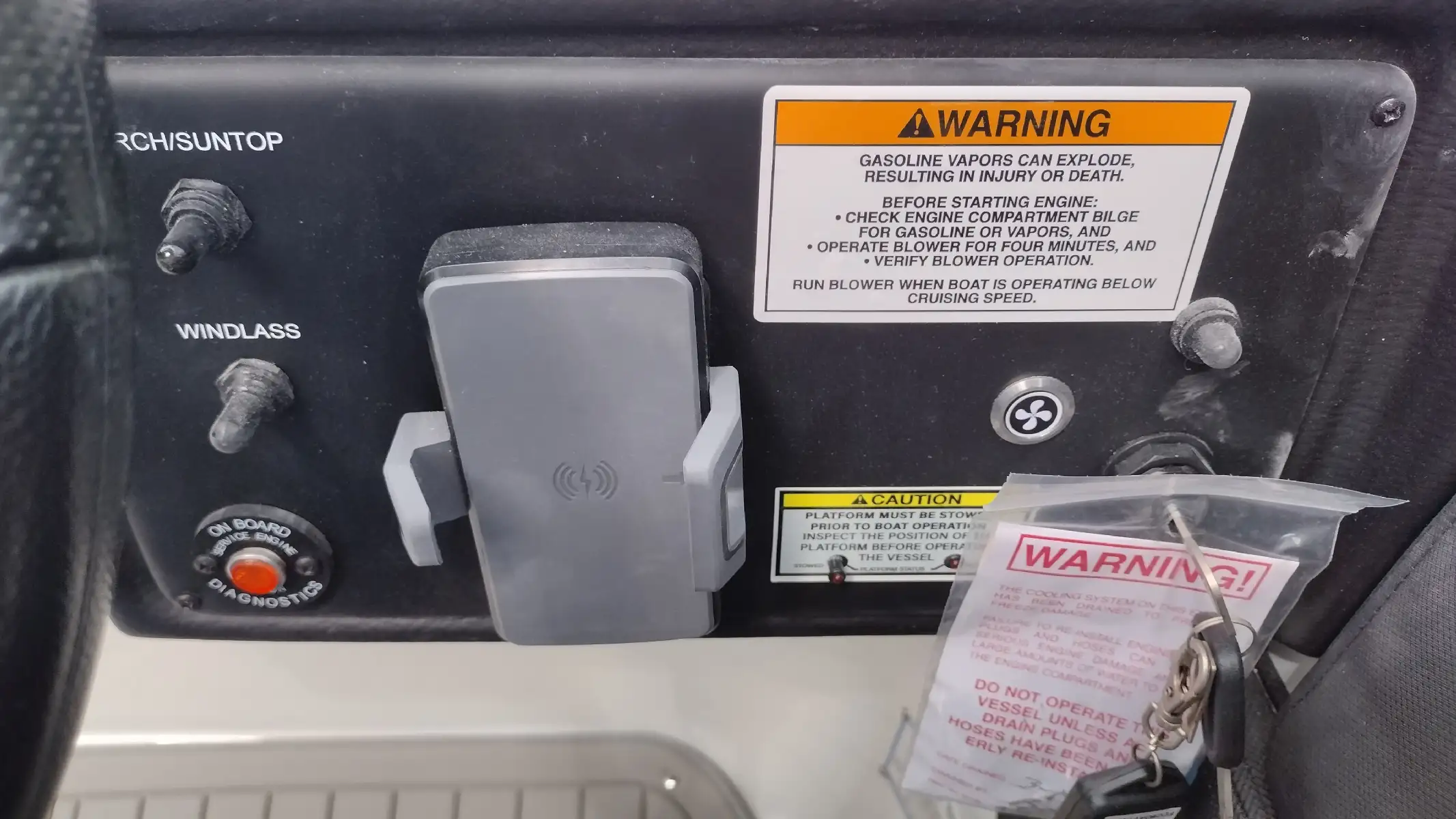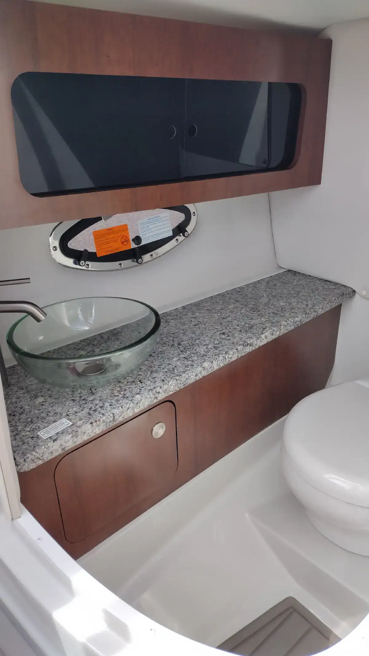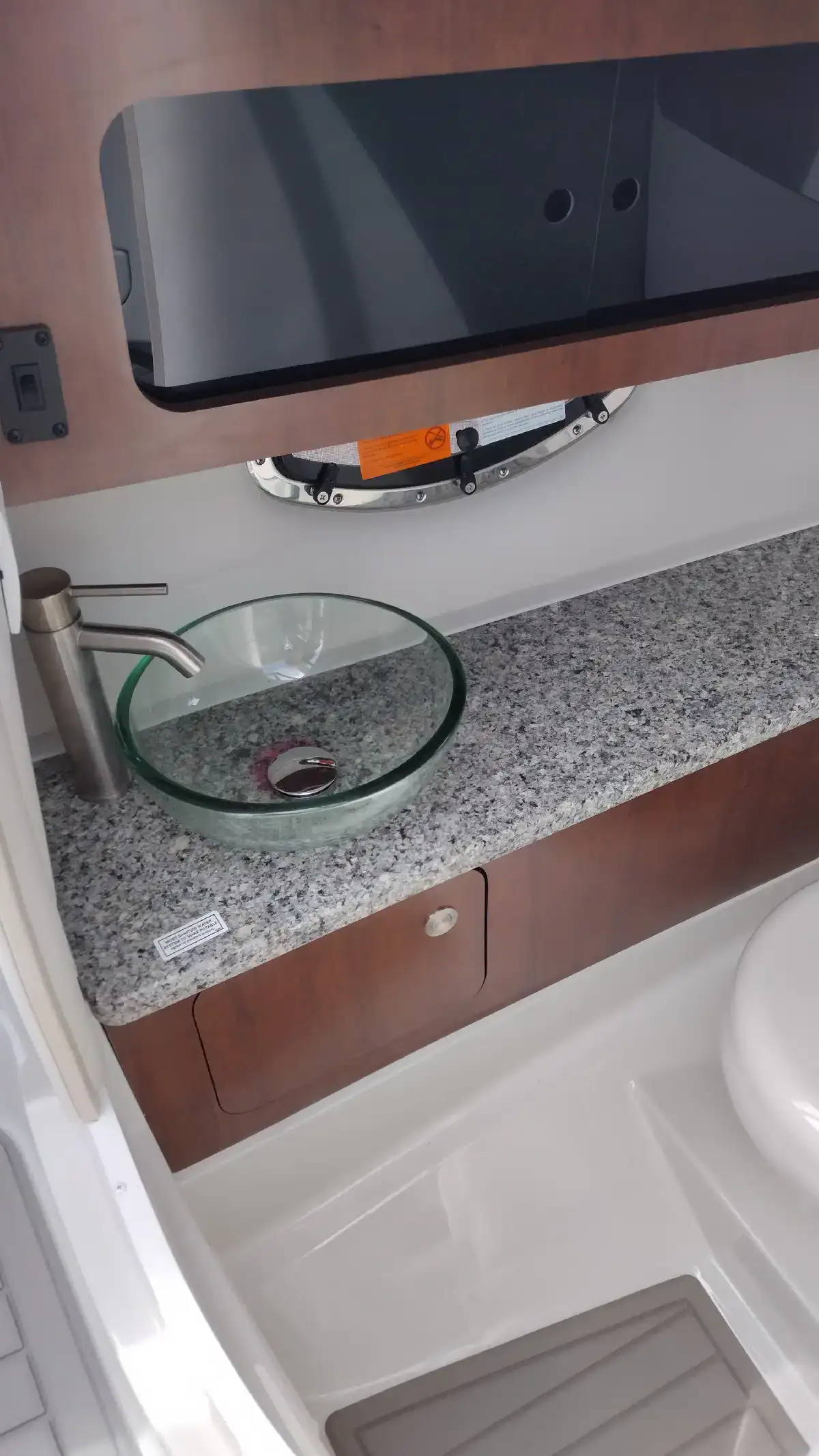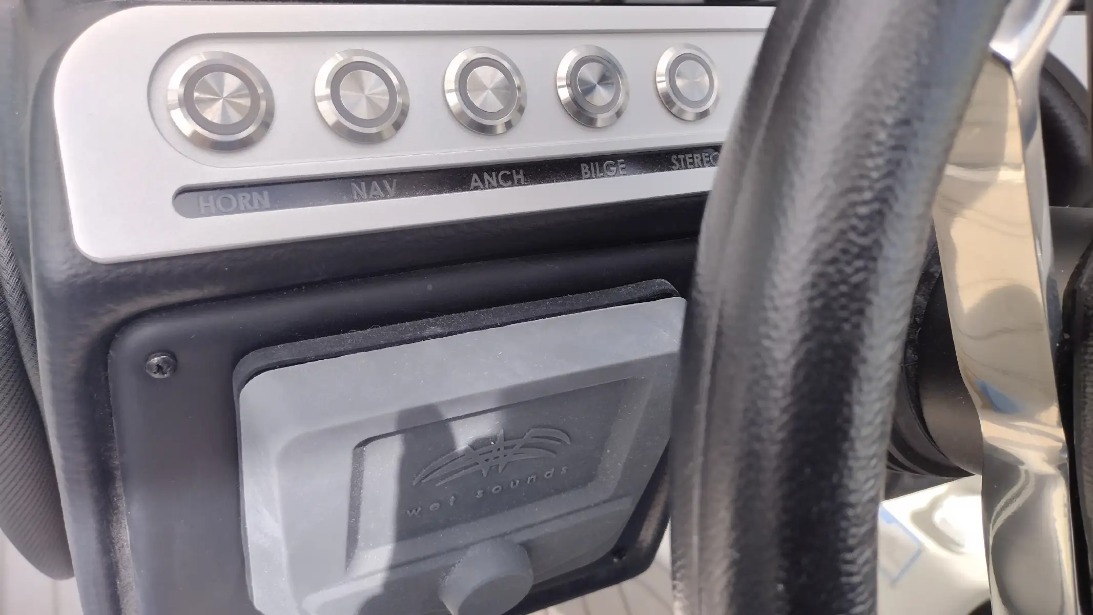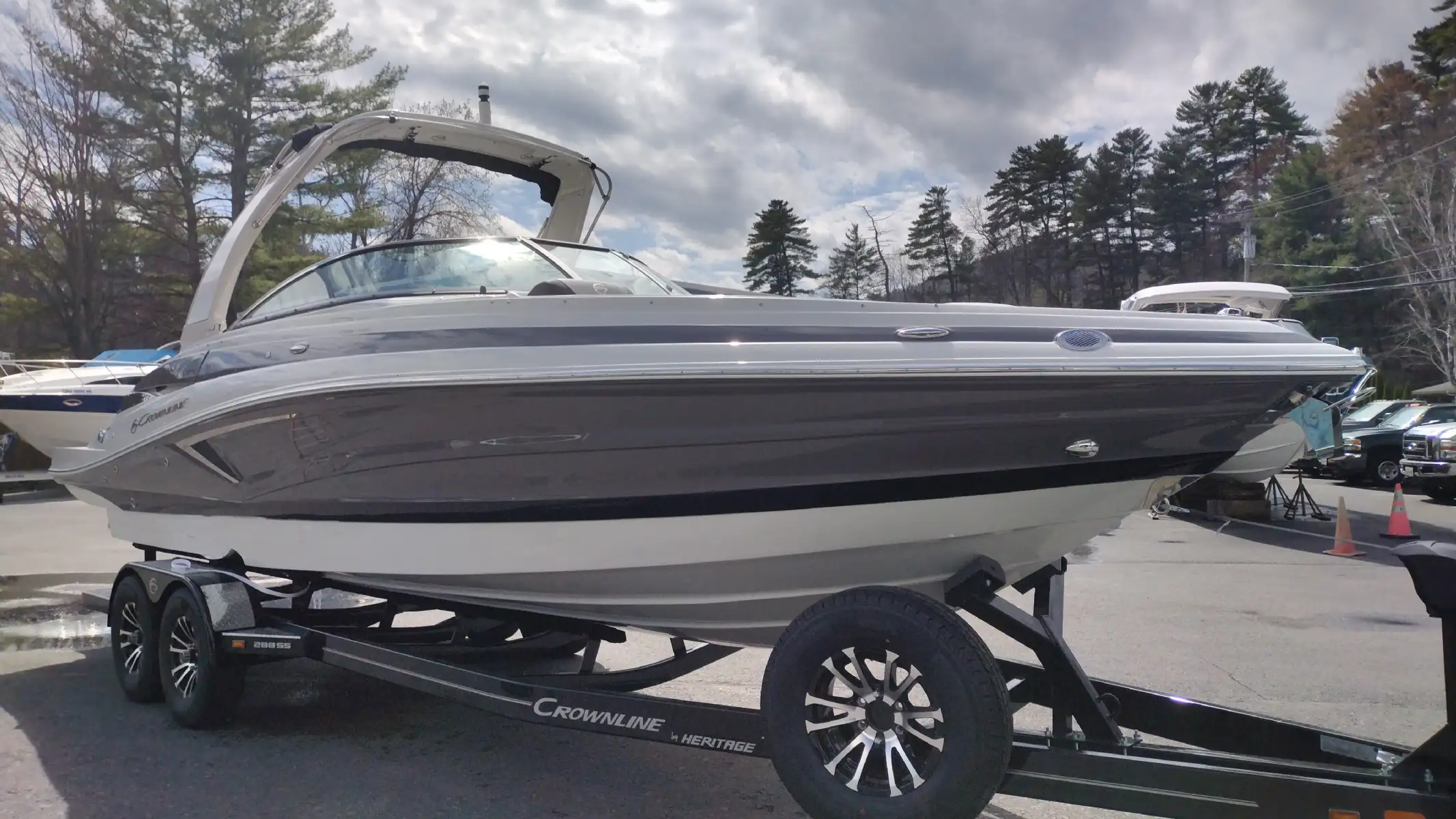 Standard Features Include; Bowrider, Bow & Cockpit Cover, Electric Fold Down Arch w/Sun Top & LED Lights, Snap In Soft Touch Mat, Cockpit Sink & Refrigerator, Battery Charger, Windlass Anchor, Cell Phone Holder w/Wireless Charging & USB-C Port, Enclosed Electric Flush Head w/Holding Tank & Vanity w/Sink, Docking Lights, LED Courtesy Lights w/Keychain Remote, Underwater Transom Lights, Powered Swim Step w/Boarding Assist Handle, Swim Platform w/ Soft Touch Mat & Ladder, Aft Electric Sun Lounge w/Dual Actuators, Hand-held Cold Freshwater Shower at Stern, Pop up Steel Ski Tow, Portable Side Mount Table, Transom Trim Switch, Trim Tabs w/Indicators, Fender Clips