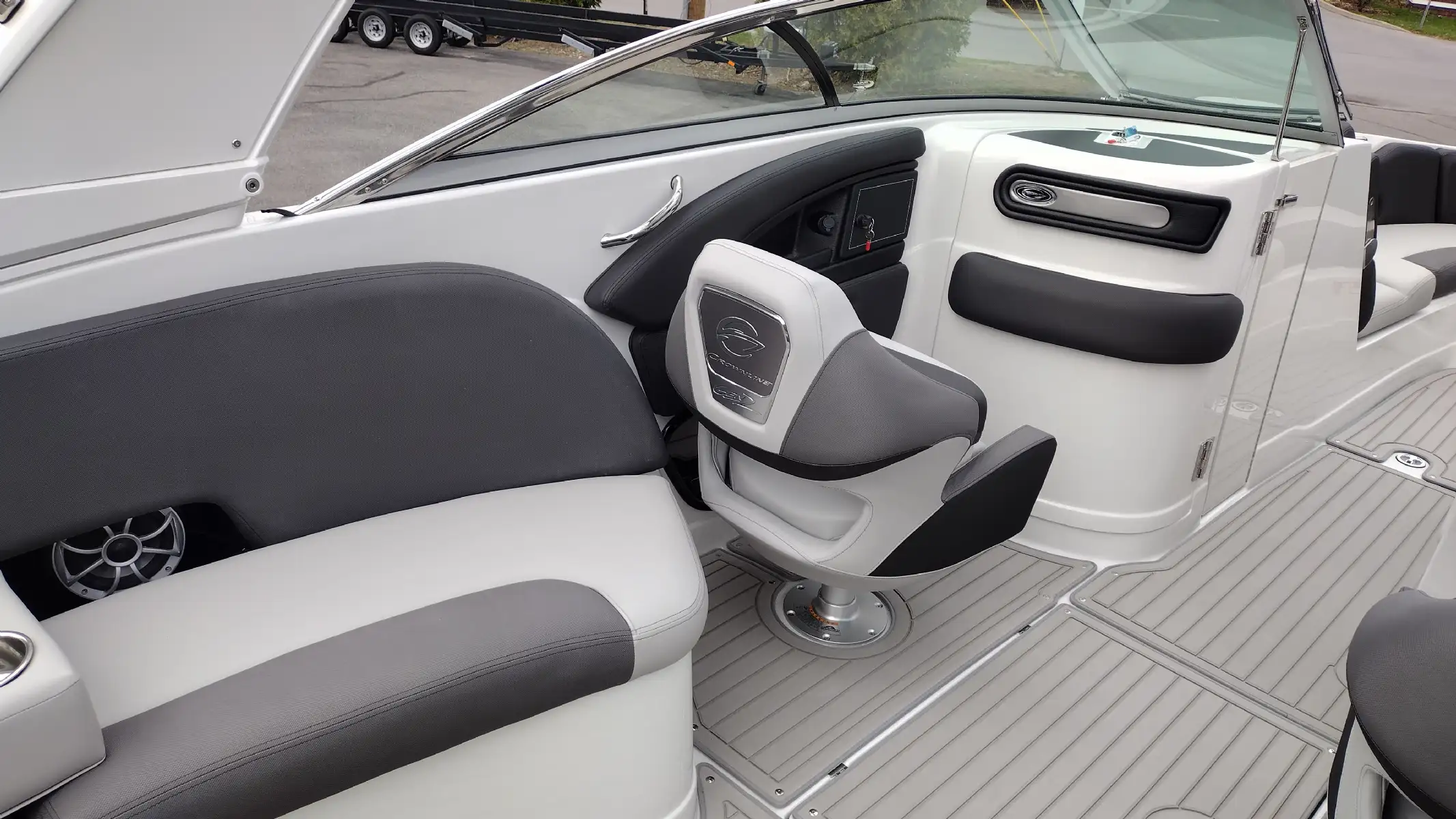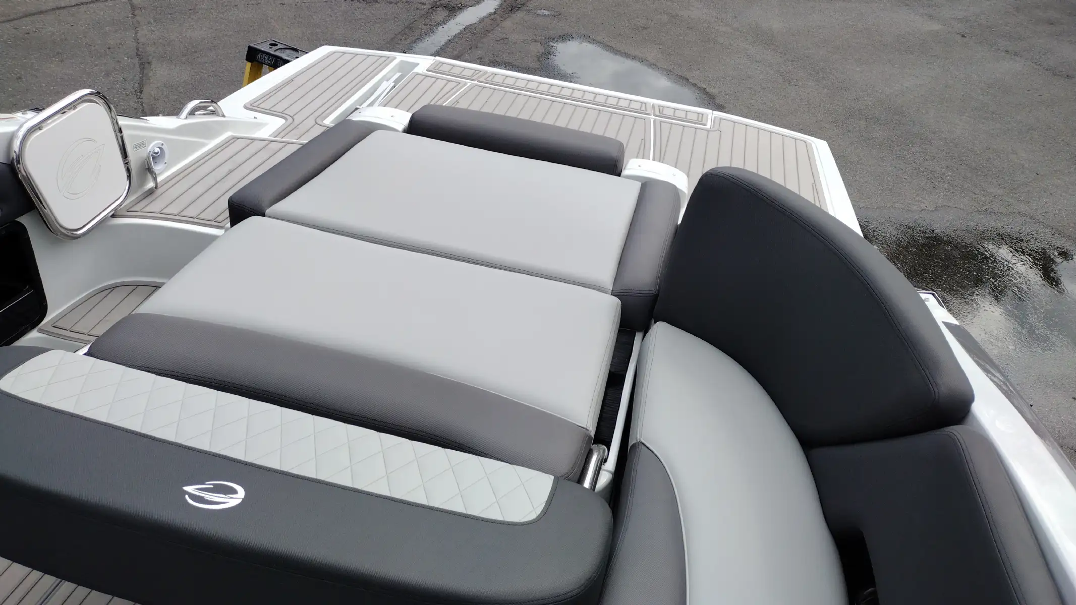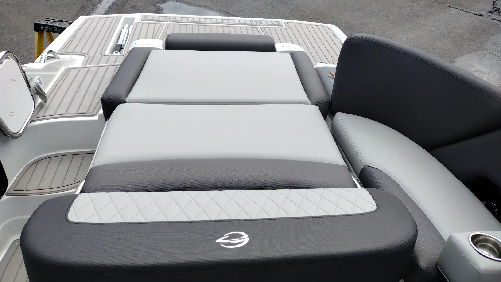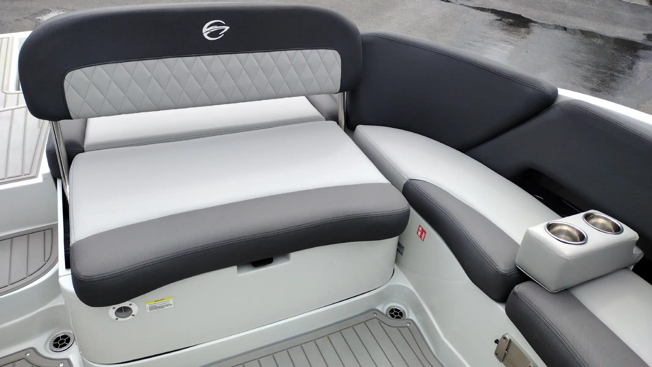 Standard Features Include; Bowrider, Bow & Cockpit Cover, Electric Fold Down Arch w/Sun Top & LED Lights, Snap In Soft Touch Mat, Cockpit Sink & Refrigerator, Battery Charger, Windlass Anchor, Cell Phone Holder w/Wireless Charging & USB-C Port, Enclosed Electric Flush Head w/Holding Tank & Vanity w/Sink, Docking Lights, LED Courtesy Lights w/Keychain Remote, Underwater Transom Lights, Powered Swim Step w/Boarding Assist Handle, Swim Platform w/ Soft Touch Mat & Ladder, Aft Electric Sun Lounge w/Dual Actuators, Hand-held Cold Freshwater Shower at Stern, Pop up Steel Ski Tow, Portable Side Mount Table, Transom Trim Switch, Trim Tabs w/Indicators, Fender Clips