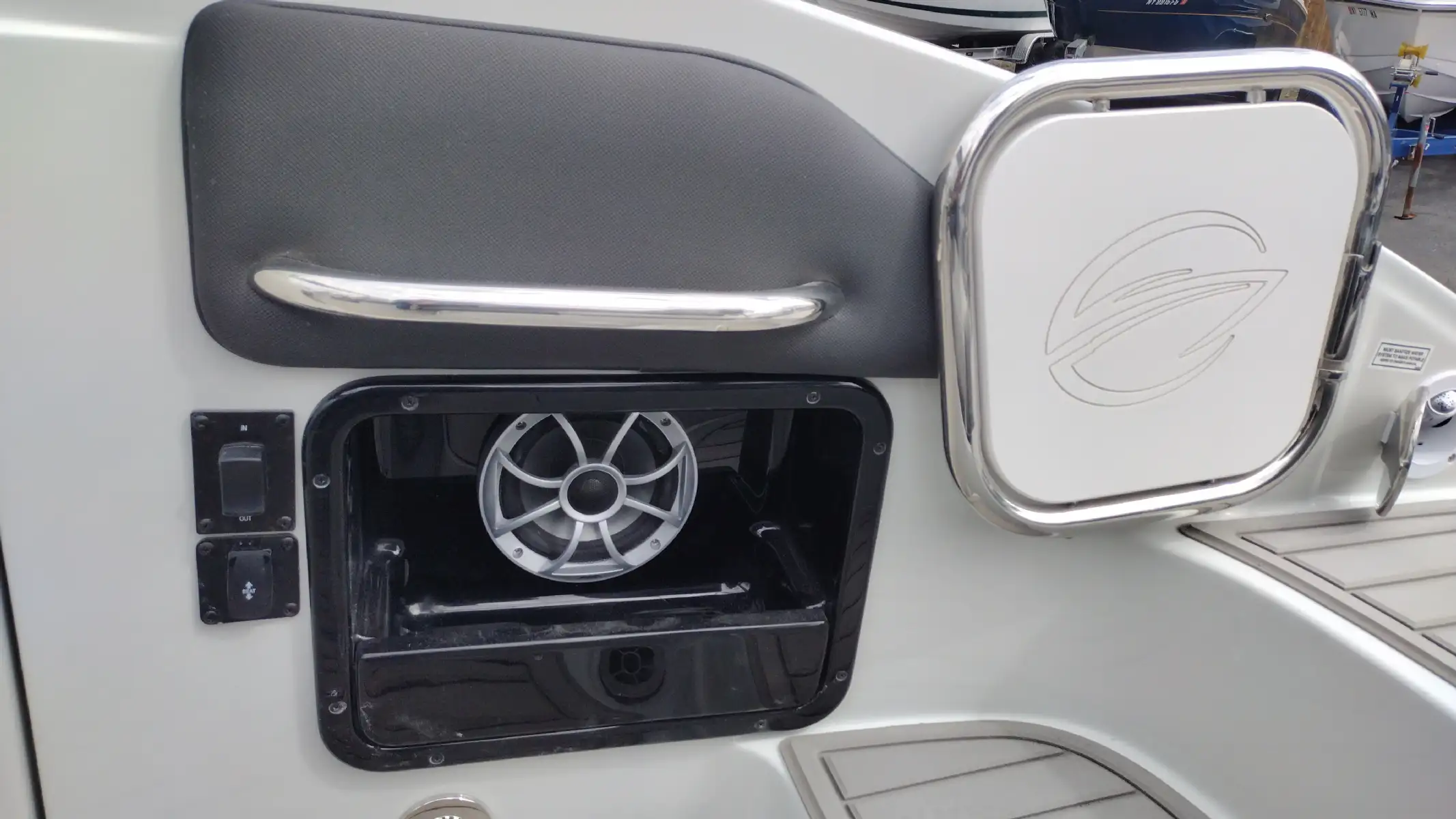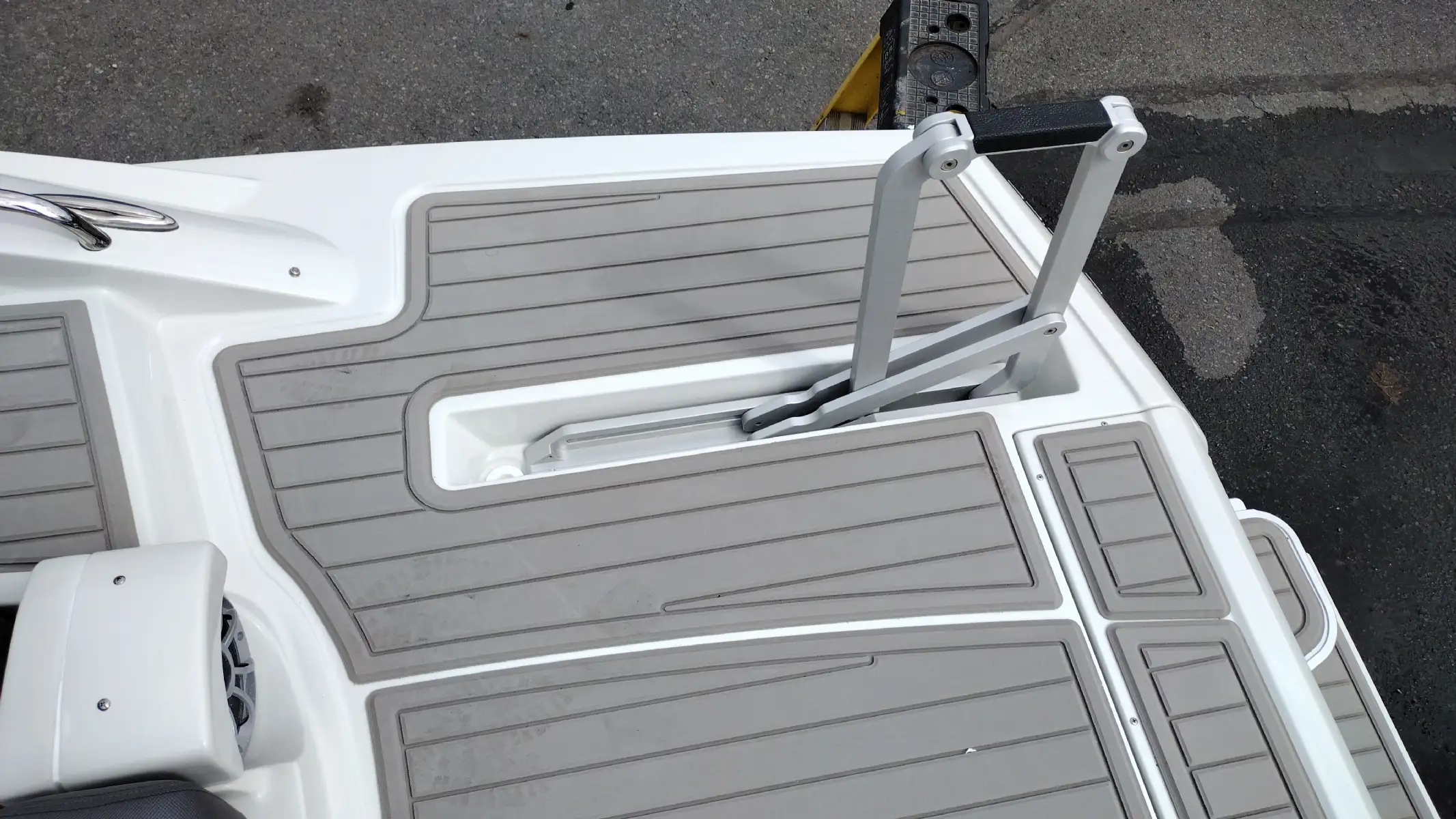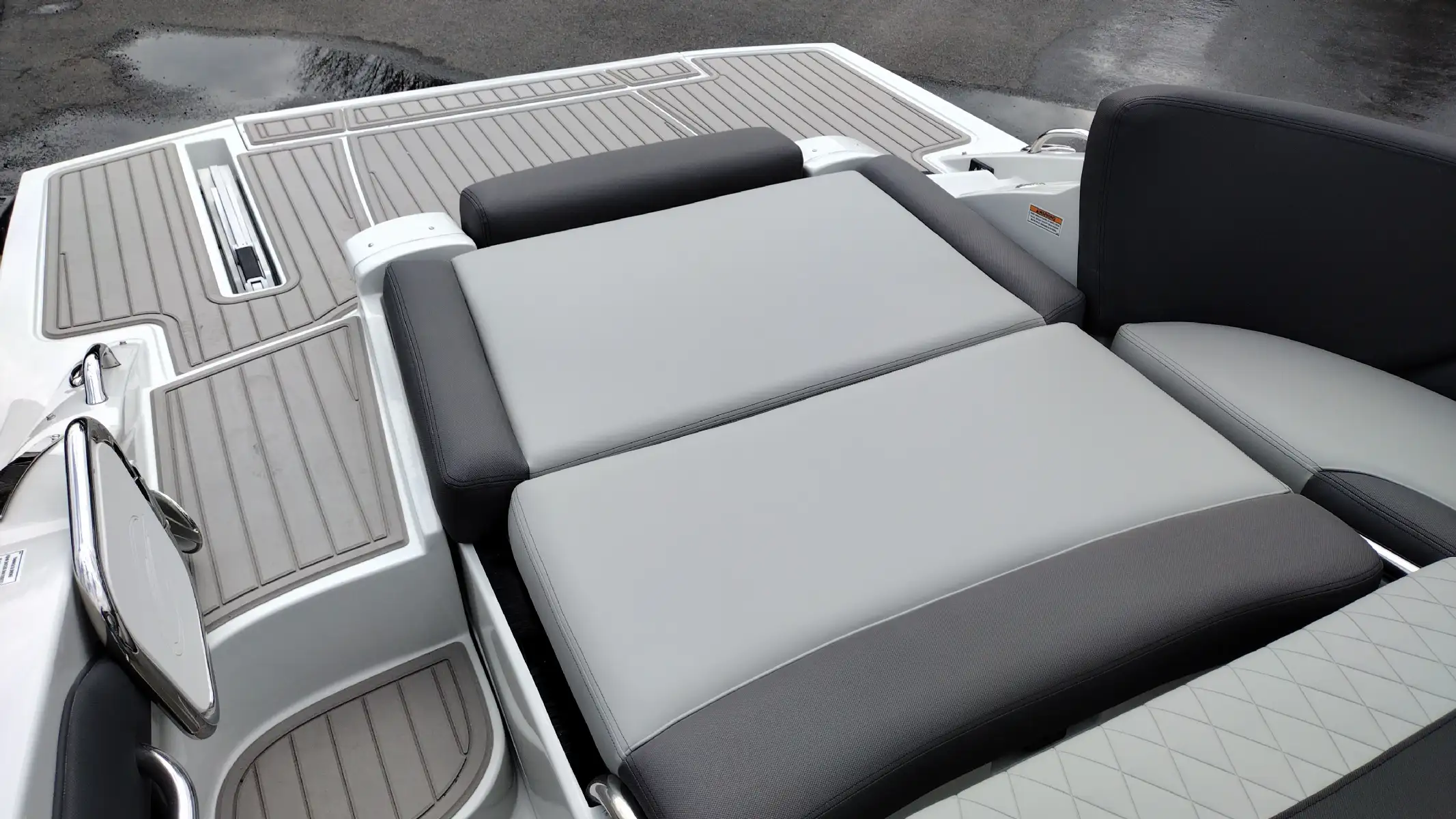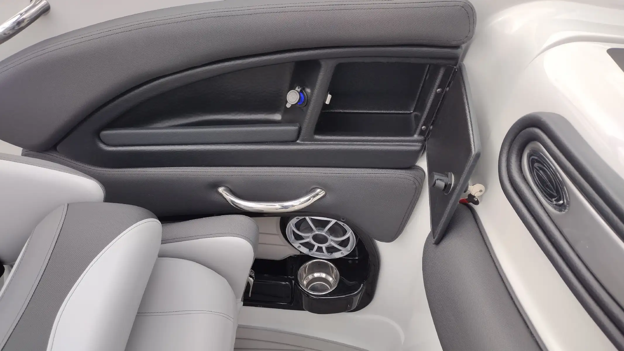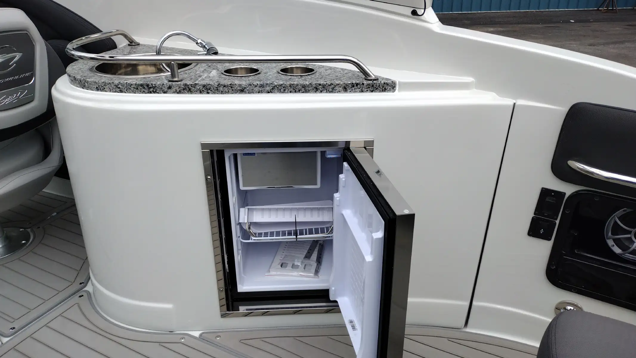 Standard Features Include; Bowrider, Bow & Cockpit Cover, Electric Fold Down Arch w/Sun Top & LED Lights, Snap In Soft Touch Mat, Cockpit Sink & Refrigerator, Battery Charger, Windlass Anchor, Cell Phone Holder w/Wireless Charging & USB-C Port, Enclosed Electric Flush Head w/Holding Tank & Vanity w/Sink, Docking Lights, LED Courtesy Lights w/Keychain Remote, Underwater Transom Lights, Powered Swim Step w/Boarding Assist Handle, Swim Platform w/ Soft Touch Mat & Ladder, Aft Electric Sun Lounge w/Dual Actuators, Hand-held Cold Freshwater Shower at Stern, Pop up Steel Ski Tow, Portable Side Mount Table, Transom Trim Switch, Trim Tabs w/Indicators, Fender Clips